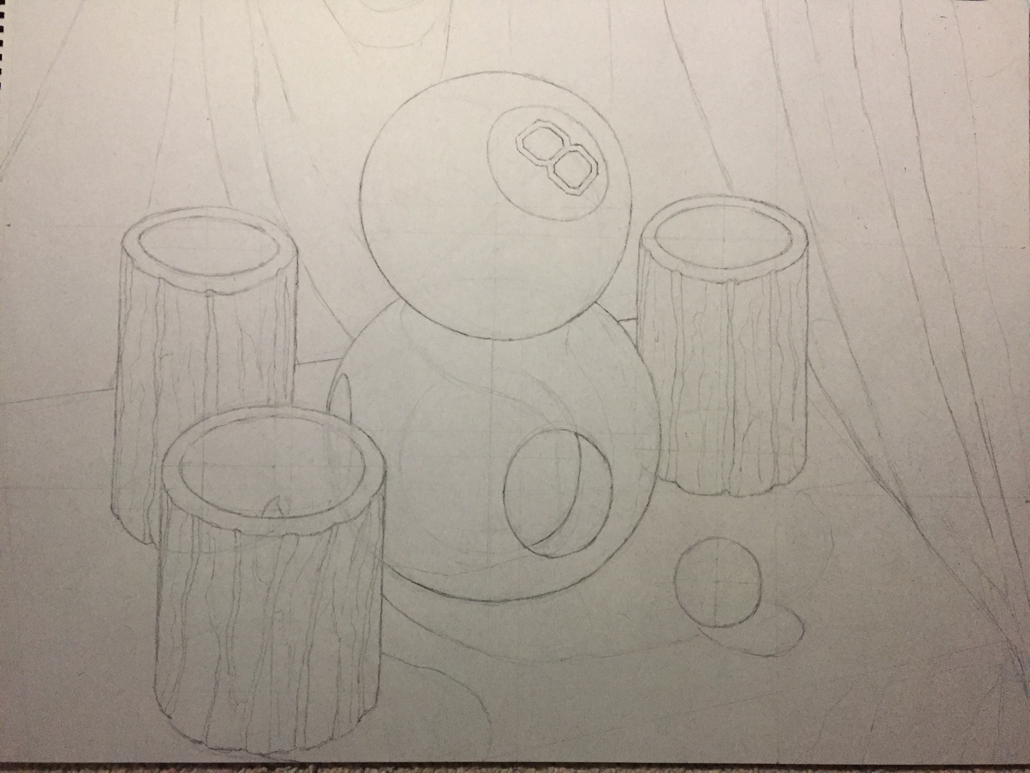 After taking all measurements into consideration and roughing out my piece, I began darkening in details and cleaning up my sketch, as well as drawing out where shadows will be cast. This stage solidified my objects to prepare for shading.