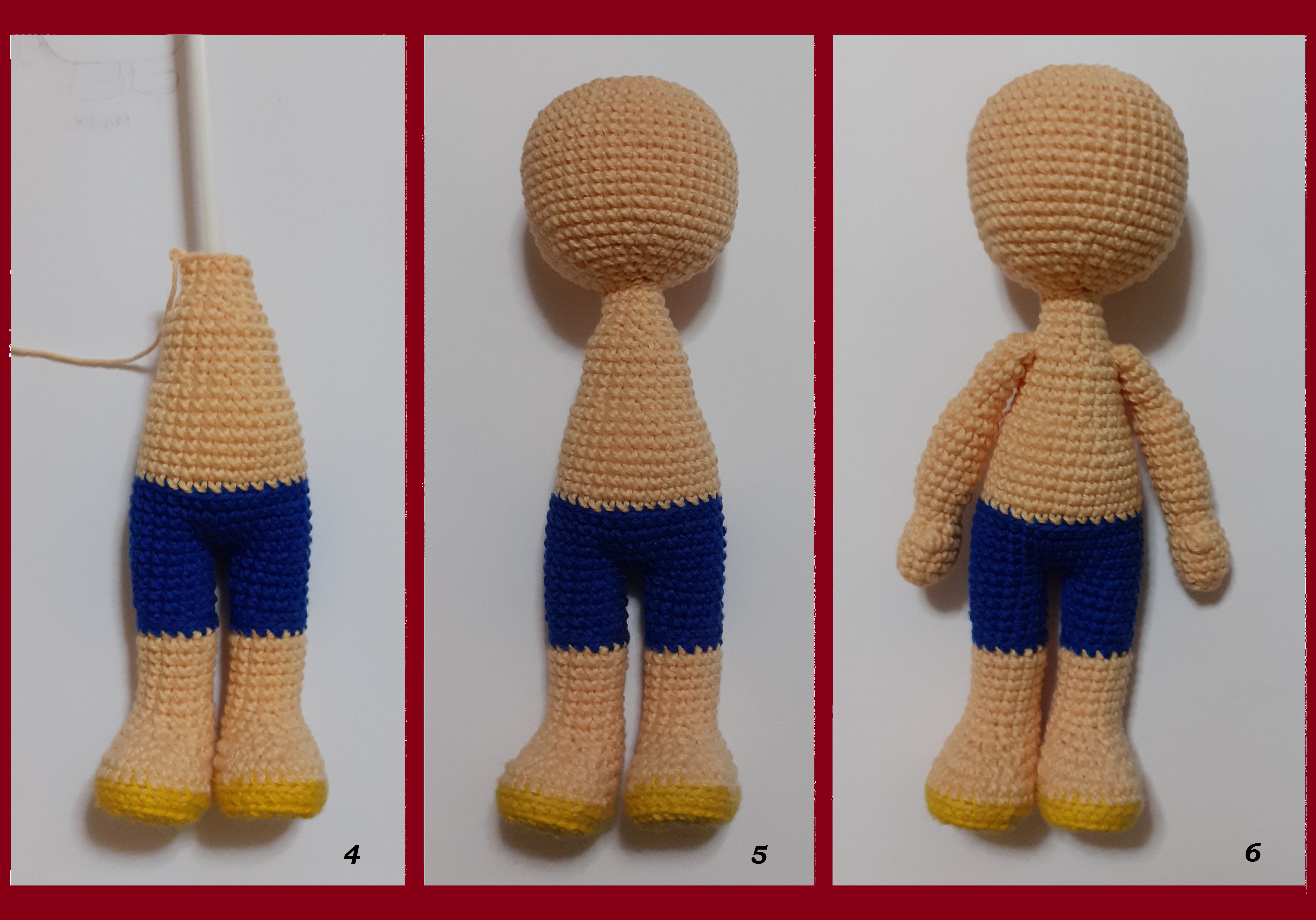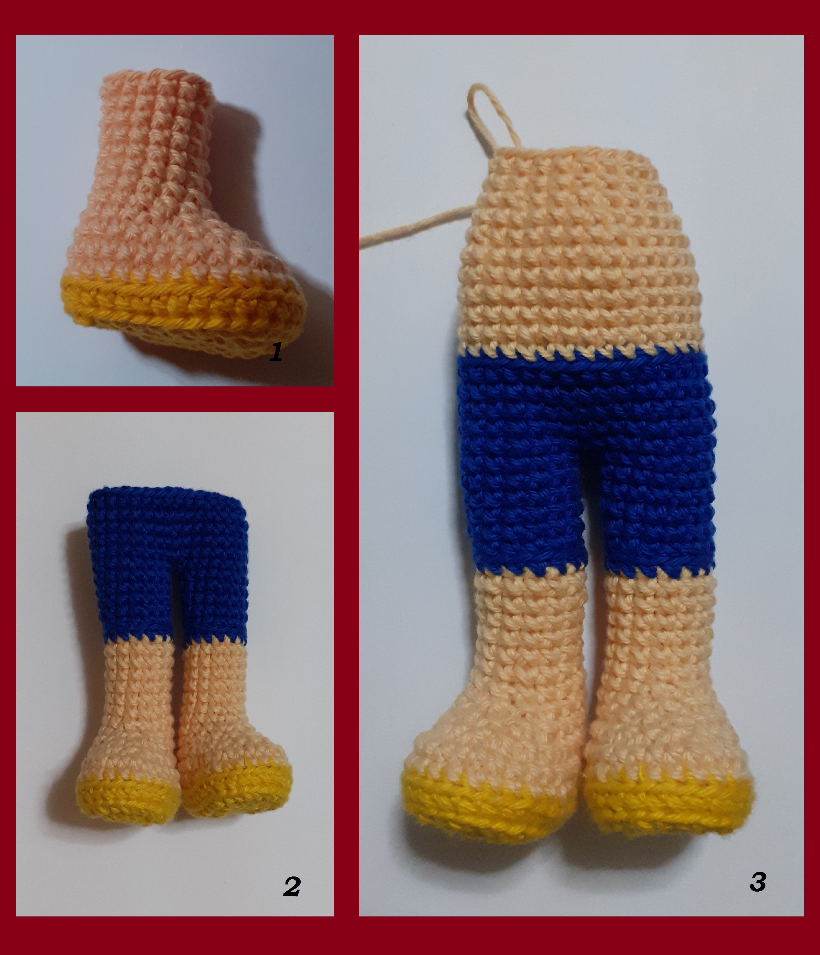 There are different ways of weaving characters. For example with the clothes attached to the body, with part of the clothes attached to the body and with the clothes apart. That in itself usually depends on the character himself, as is the case with Luffy, who was woven with some parts of the costume stuck to the body. The weaving was started by the soles of the sandals, the legs and the shorts towards the body (figures 1, 2 and 3).