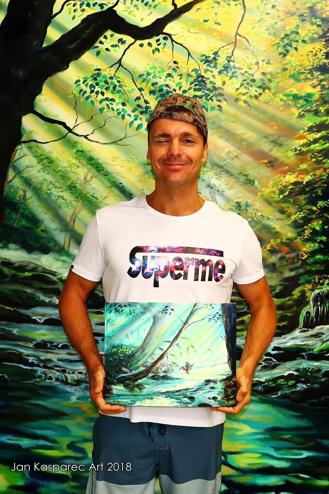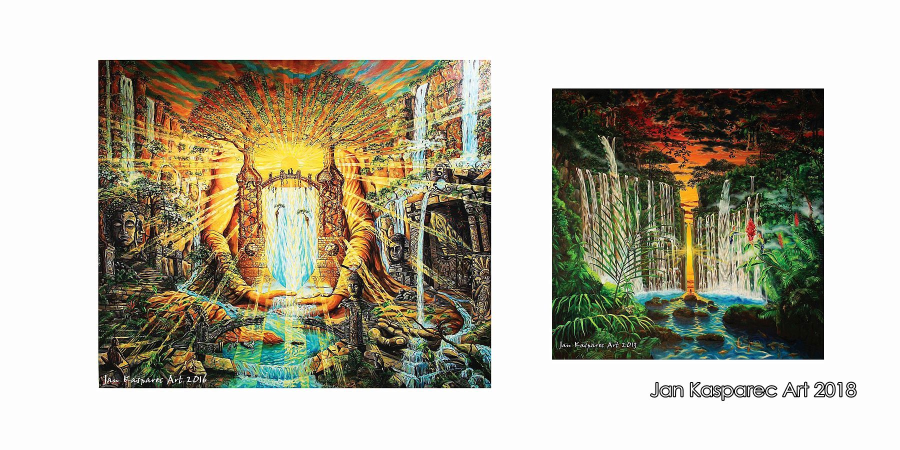 sporting my largest painting Gaia Reborn and my most favorite piece ever: Paradise (the green waterfall one).
