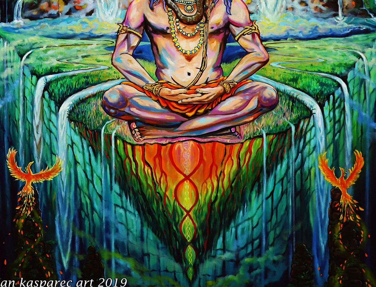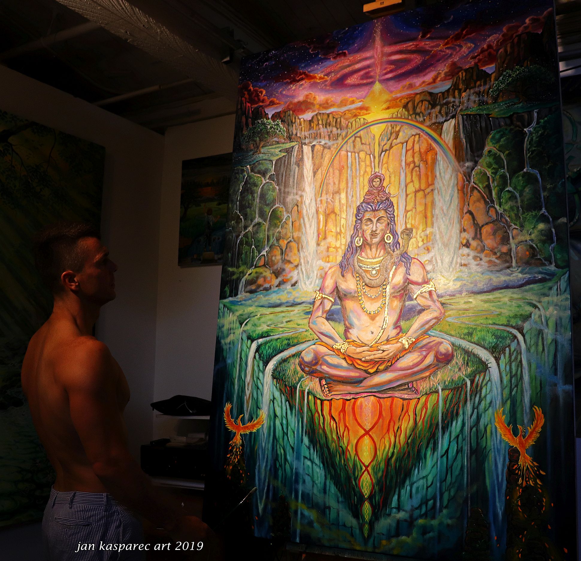 What's special about this Shiva, besides the fact that I used 24 karat gold leaf for his jewelry is my incorporation of Phoenix, the fire bird, in the painting.
