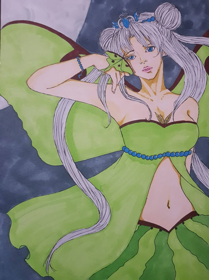 I am so in love and amazed with the color of this moth and how beautiful it is. So I decided to make an art about this moth and about its name which means moon. So I thought about the Moon Princess which is famous in Japan and mixed it up with the concept of Luna Moth.