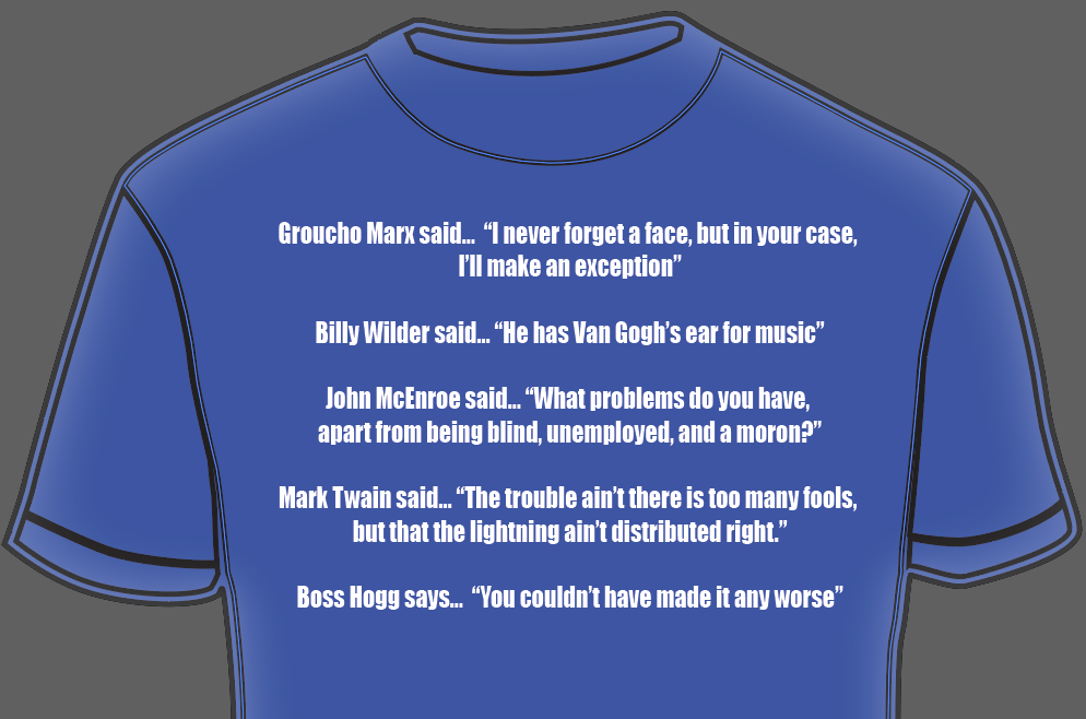 The last project I have been working on is another shirt idea for our radio station. The radio station has been growing at an exceptional rate, securing two additional locations to add to their original one they had, all in less than a year's time. In the radio station, they are a tight knit group, consistently poking fun at each other. Thus they have come up with their own -isms, or sayings. With that the owner has his favorite that he says to the other employees, which is "You couldn't make it any worse." With that, we came up with the idea to have shirts for them to wear and sell with that saying, plus other famous quotes poking fun at someone on the back. Here is the idea that we came up with: