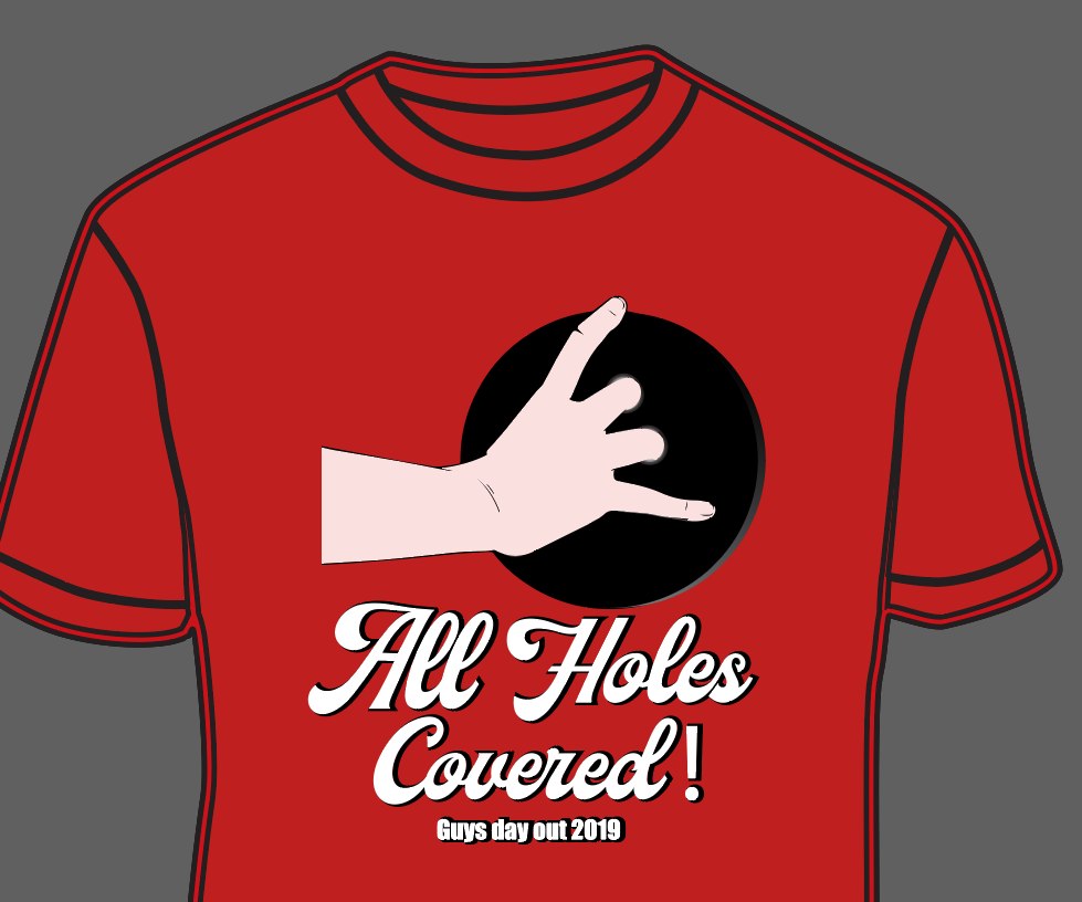 A second design I created recently was for fun. Me and a couple of my guy friends every year do a guys trip or guys day trip. The first year we went to Dave & Busters, so I created a shirt that said "Guys day out: Games before Dames". The next year we went to an all-you-can-eat Brazilian steakhouse buffet. So I created shirts that said "Guys day out: Meat sweats, Zero Regrets". This year we are going bowling, so here was the shirt I created. It's a little risqué, but still gave us all a good laugh: