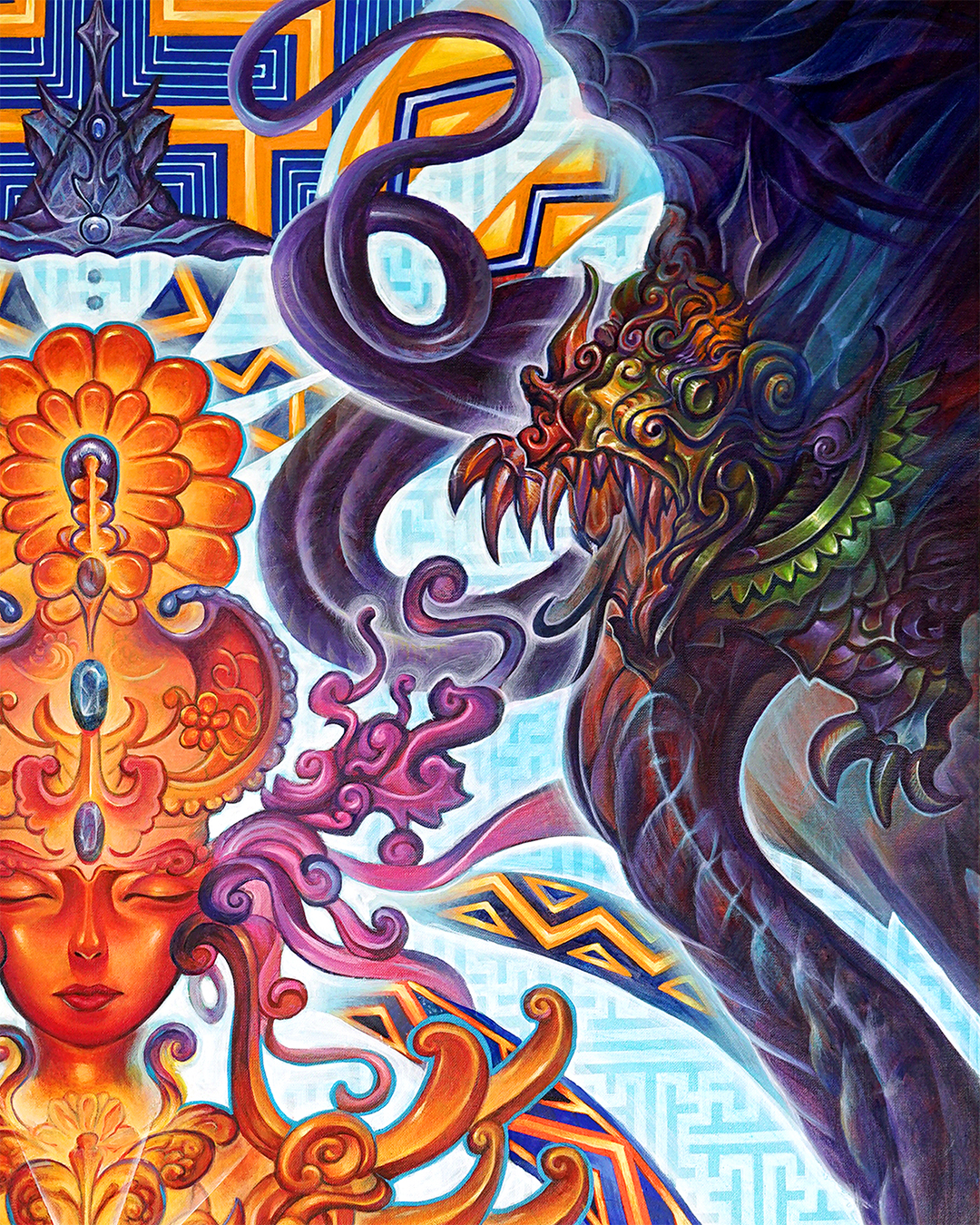 I started this painting in Bali and it was destined to be finished here. This painting has journeyed far with me. I worked on this painting at Boom festival in Portugal, under the solar eclipse in Oregon, and onstage at Bali Spirit Festival.