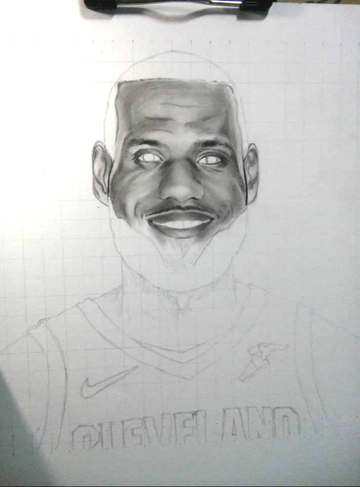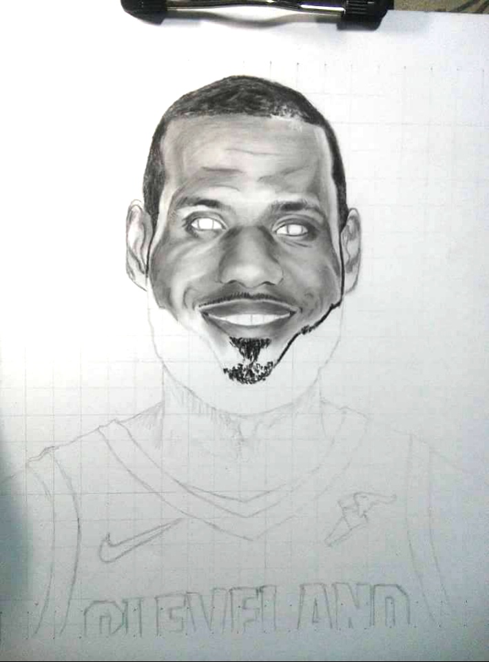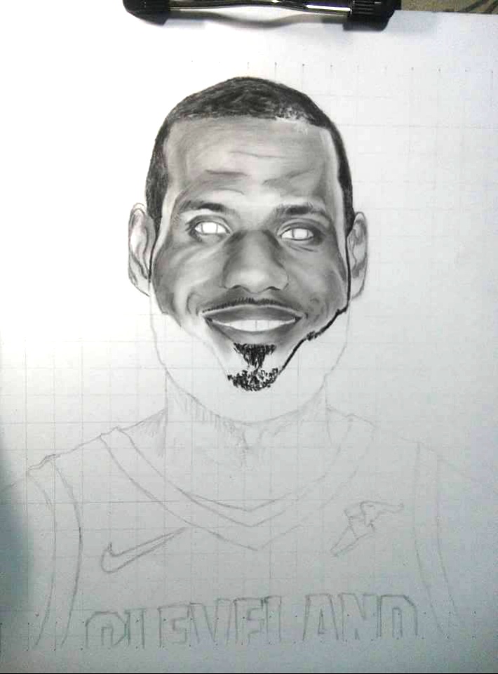 Next, I then finished neatly his face and so happy that I made it successfully. I then quickly started to outline his jersey in order to form King James in my portrait work.