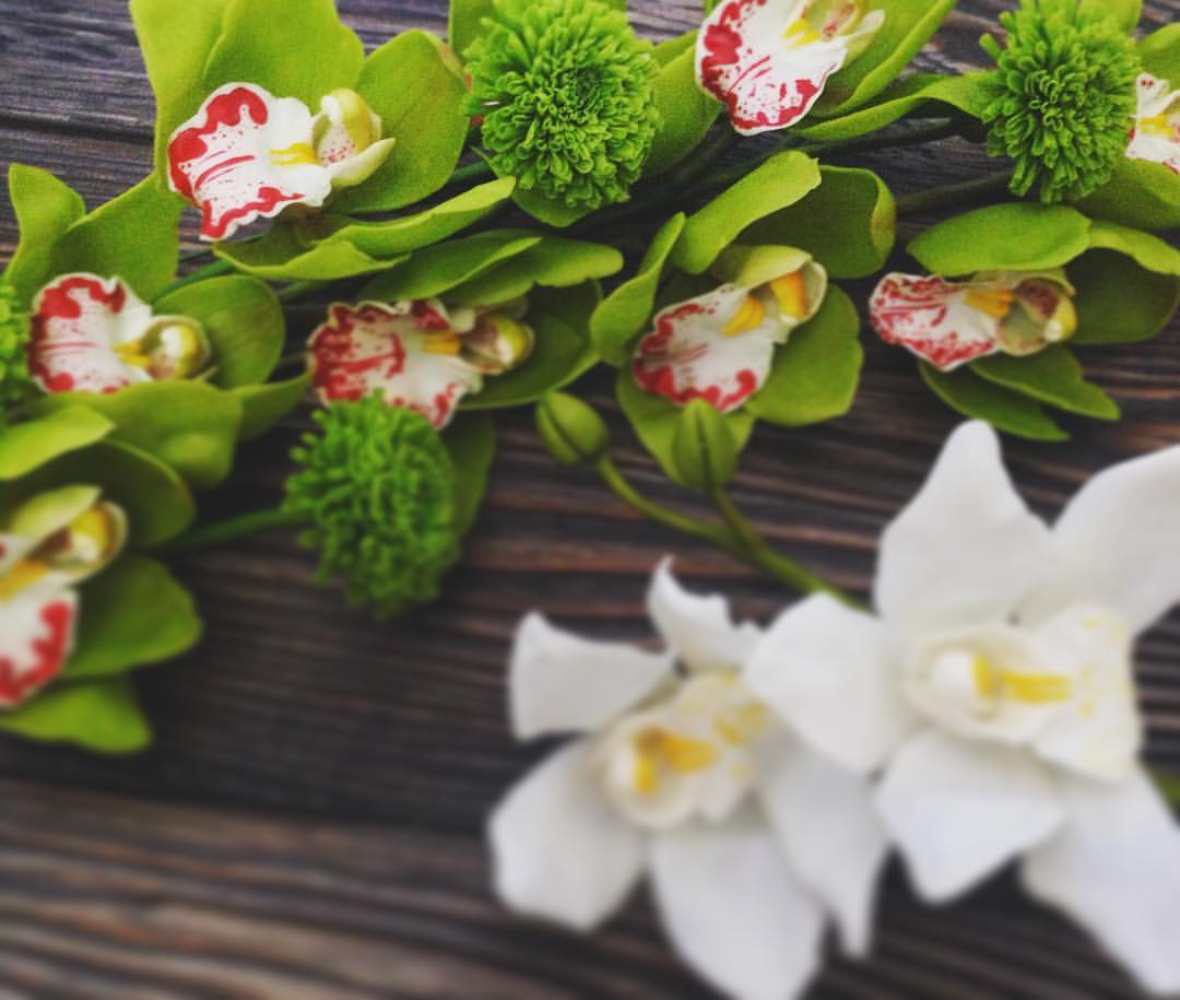 I share a new composition with orchids Cimbiumium, eustoma and chrysanthemum. All colors are made by hand.