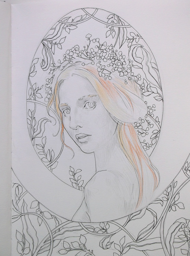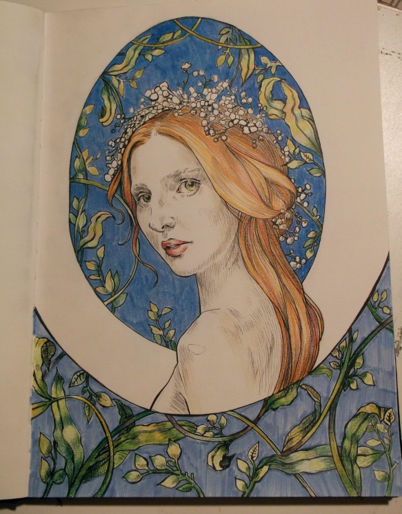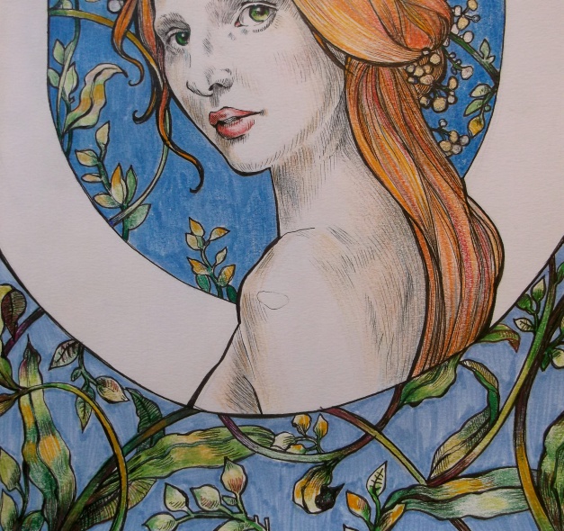 I am familiar with Alphonse Mucha and immediately recognized this piece to be heavily influenced by his work. So nice to discover it to be an homage to his work.