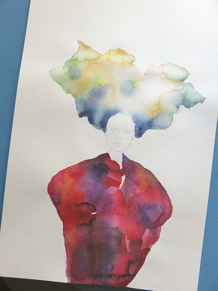 And as sketch was done, first made piles of water on her hair and putted spots of colors mixed already in bowls.