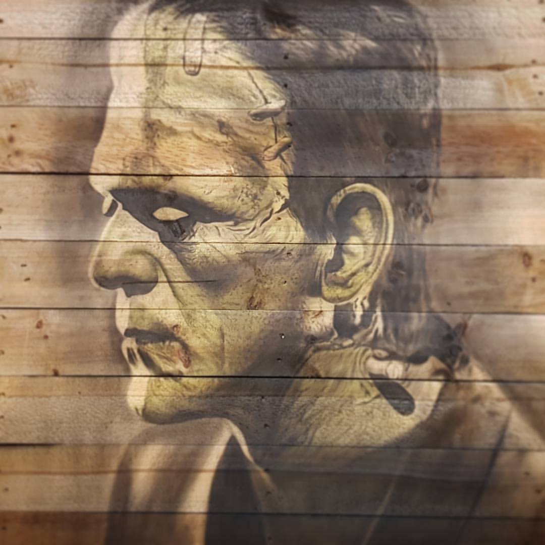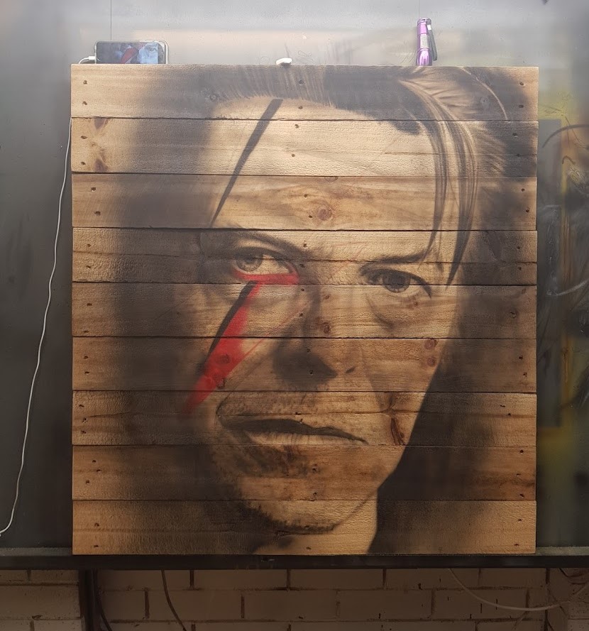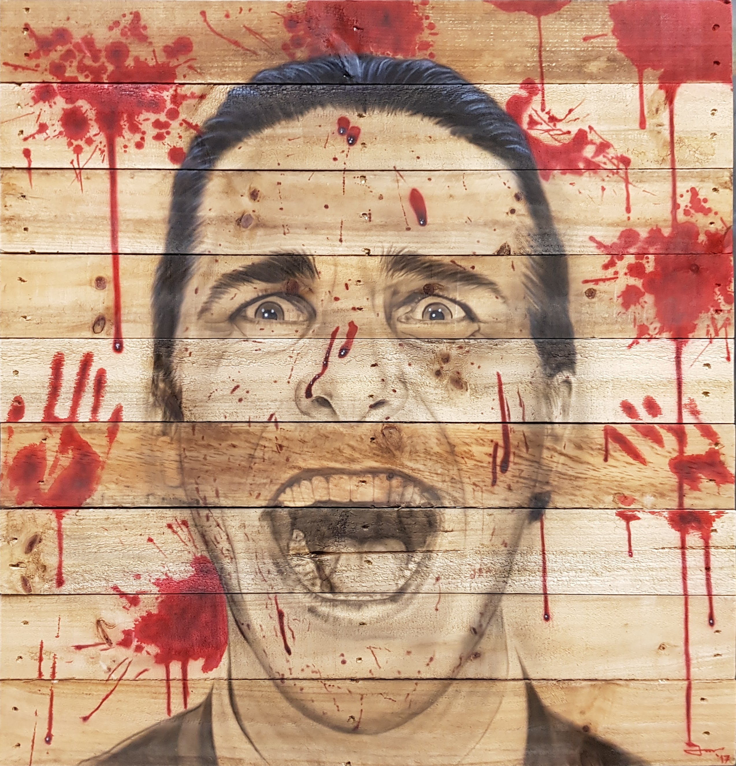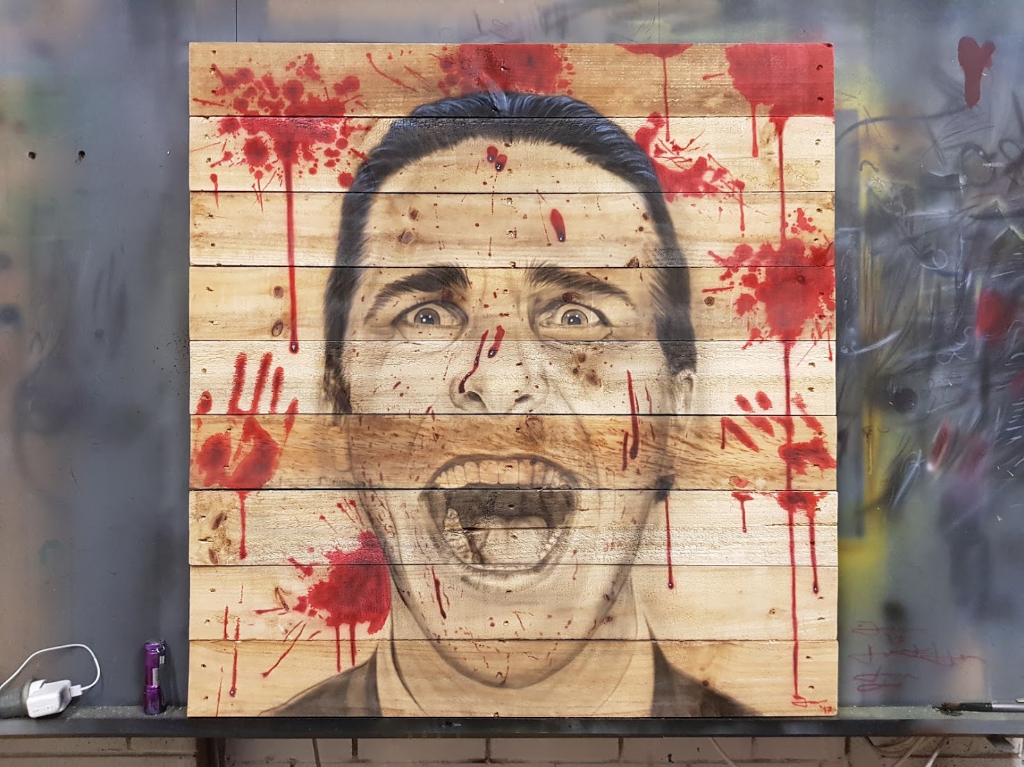 Hey everyone, I'm showing you something a bit different and unique today. This is a series based around pop culture/movie icons airbrushed on reclaimed timber pallets salvaged from a warehouse before they were thrown out. They have all been sold and are hanging proudly in their new owners homes. All of these pieces are about 80cm x 80cm in size and 100% freehand. First up is my absolute favorite out of the set, Psycho!