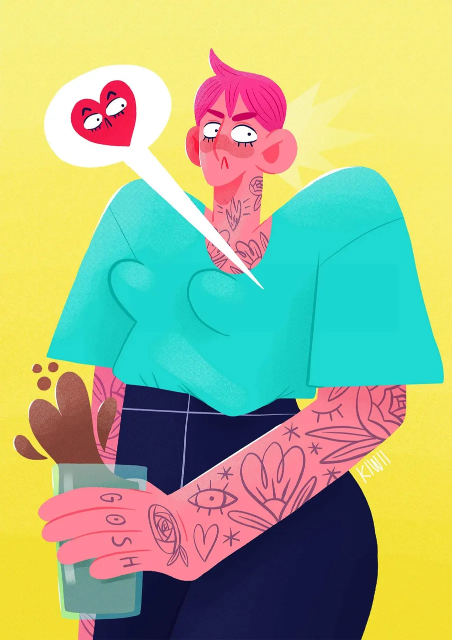 A vibrant cartoon character with pink hair and tattoos holds a drink, expressing surprise with a heart in a speech bubble popping up from their chest.