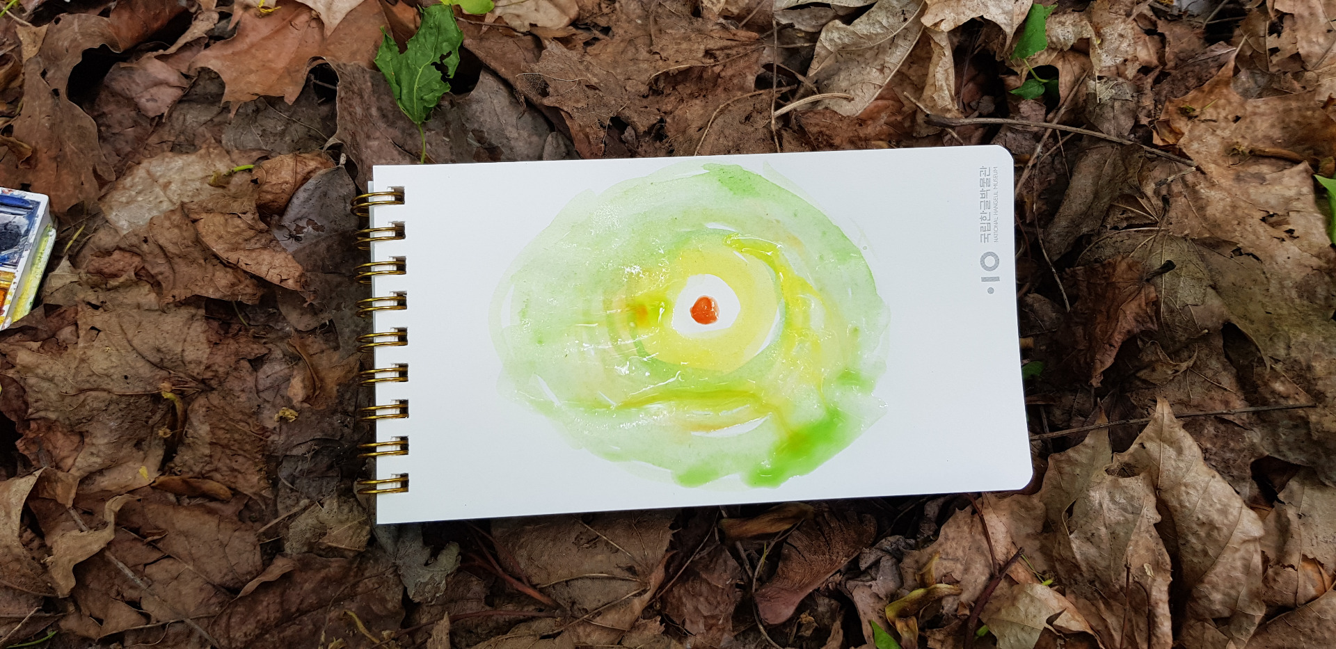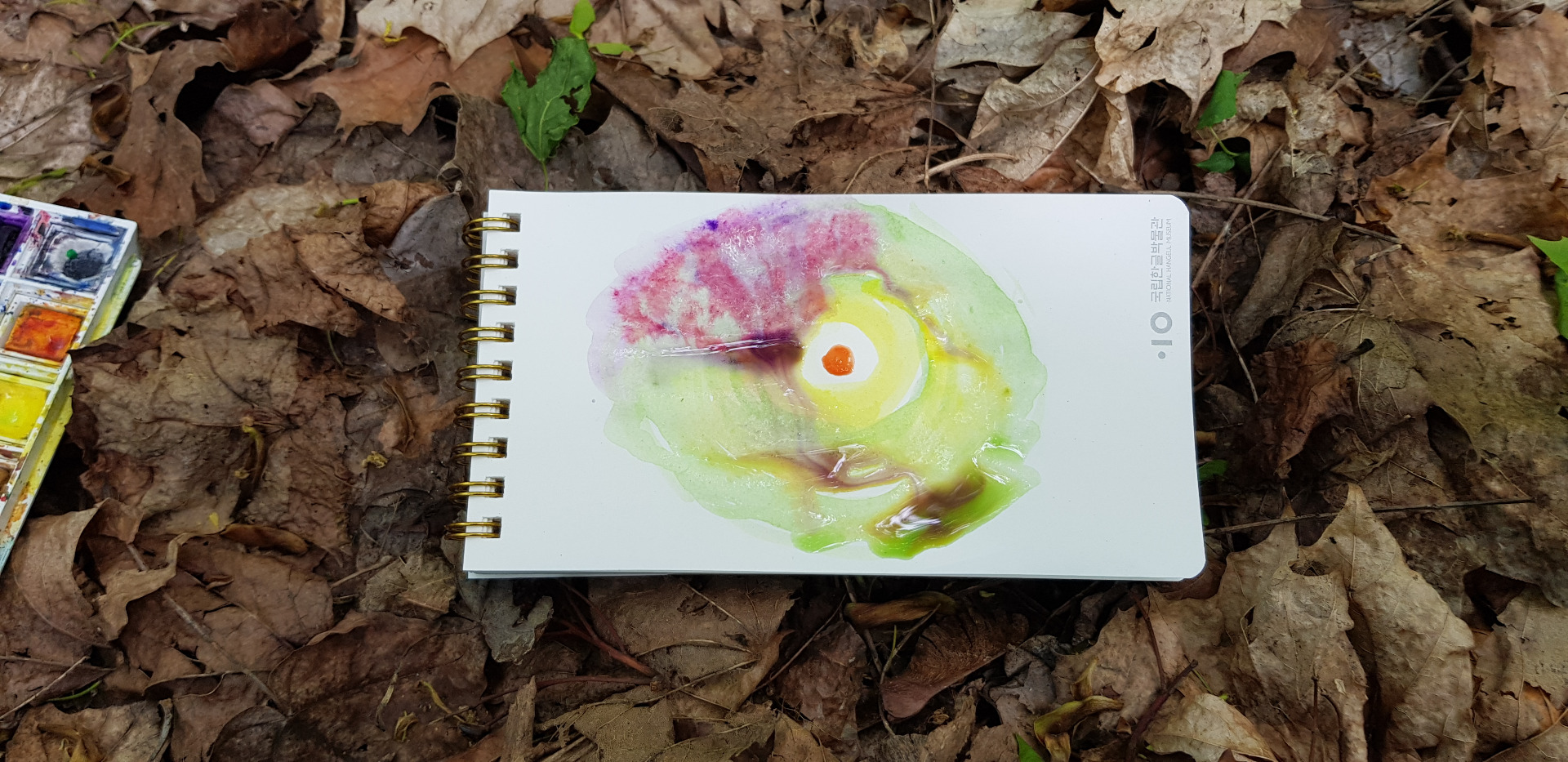 Yesterday, when I was walking in the woods, I saw such a round moss pattern growing on a tree. And I felt a desire to paint something circular on paper. I had a painting set, notebook with white pages, water and watercolors.