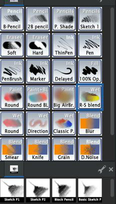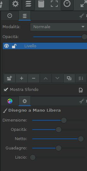 Inoltre si può dipingere su più piani di lavoro chiamati anche qui Livelli (come in Photoshop) e dal pannello dei settaggi si può ingrandire lo spessore dello strumento, renderlo più o meno trasparente e si può intervenire su molti altri parametri.