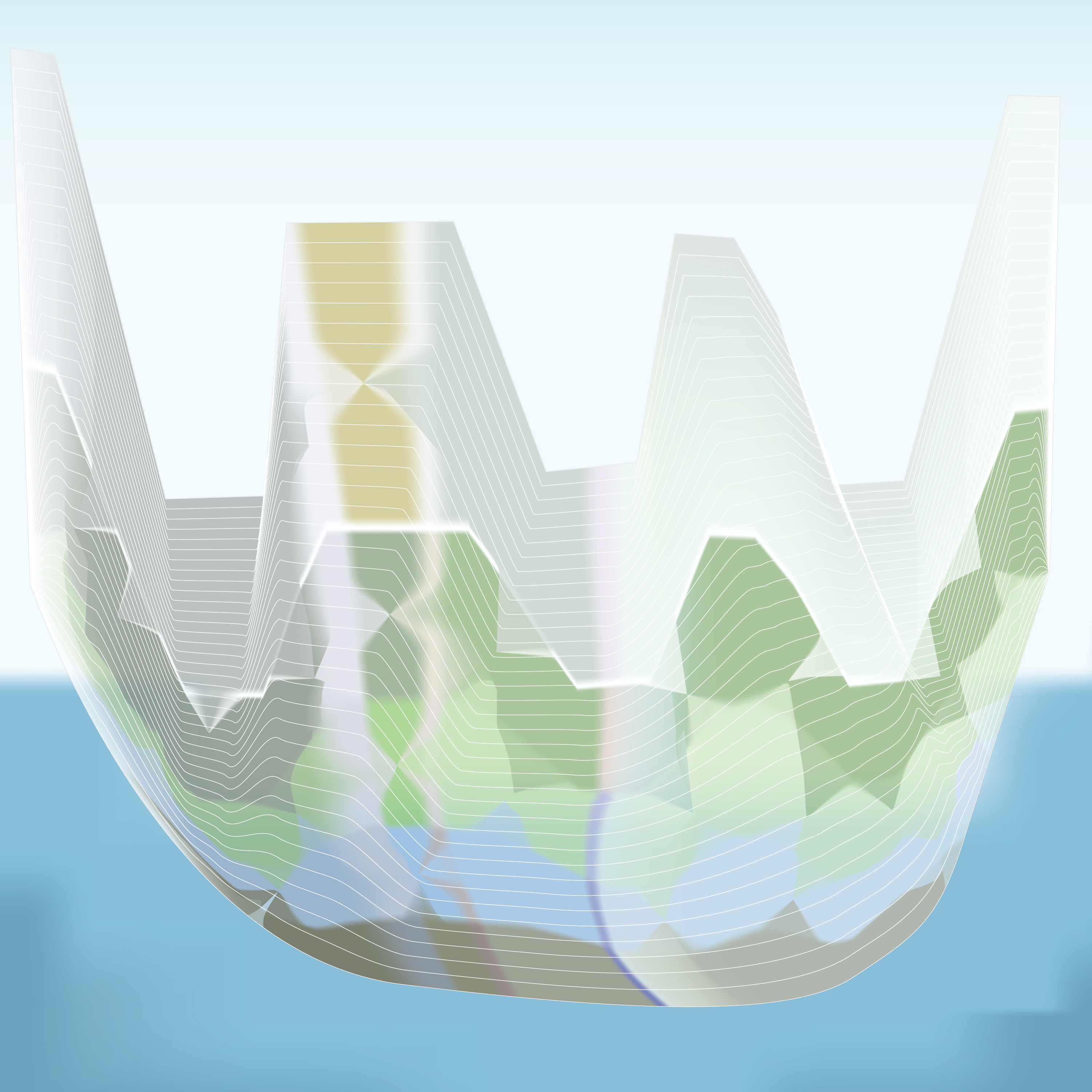 I've stepped away from the RGB universe for a bit to play in a new mode, this one a fusion of several techniques I've used in the past. What these images all share is that in each there is some sort of strange object positioned in a space, in a vague, abstracted landscape of whatever sort. In each work I've tried to keep the focus on the object and make the background world very simple.