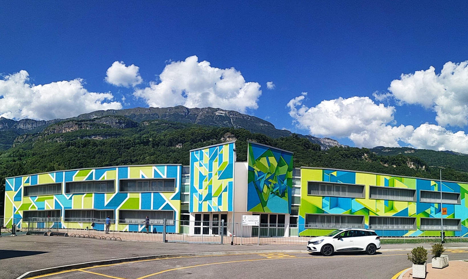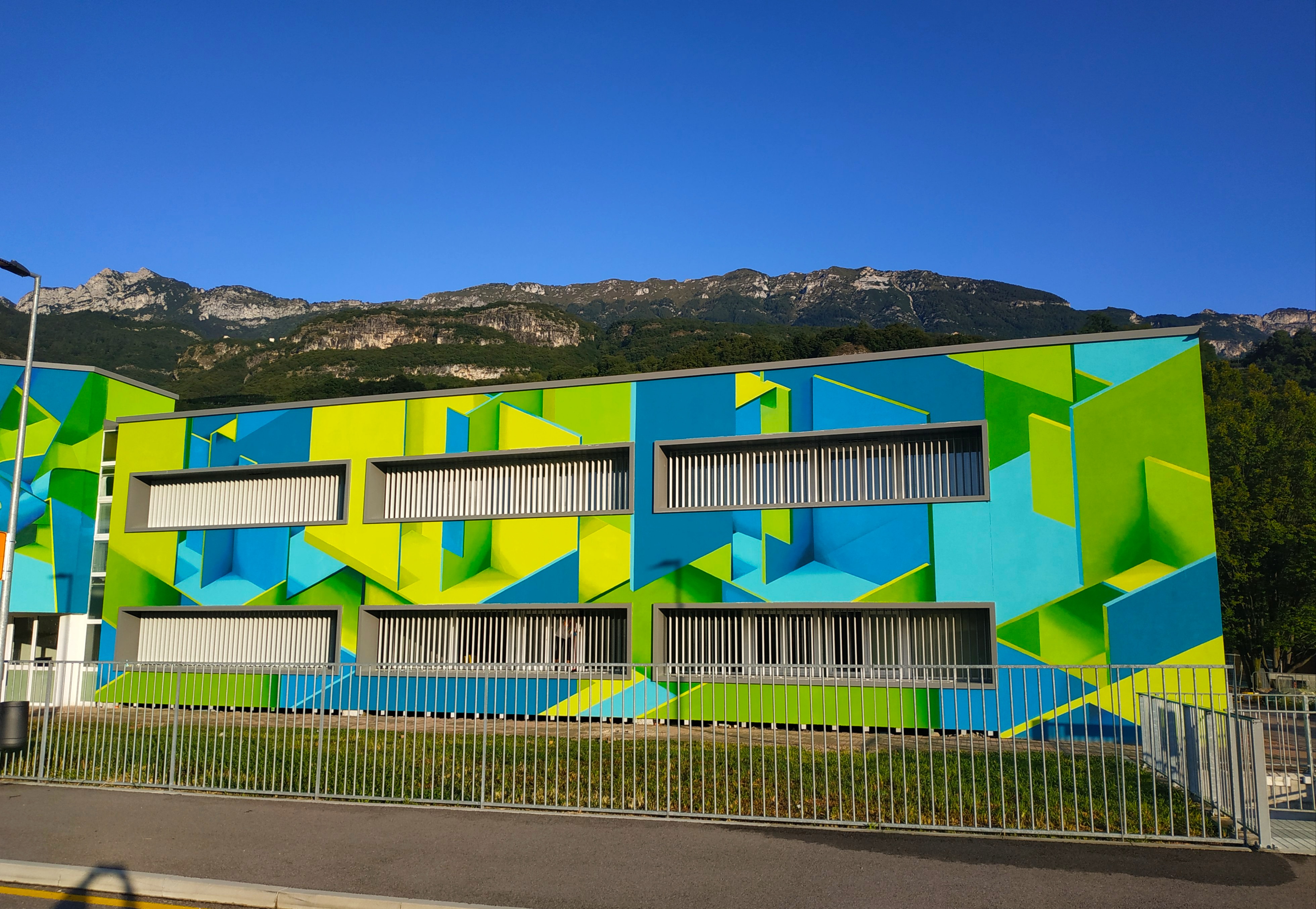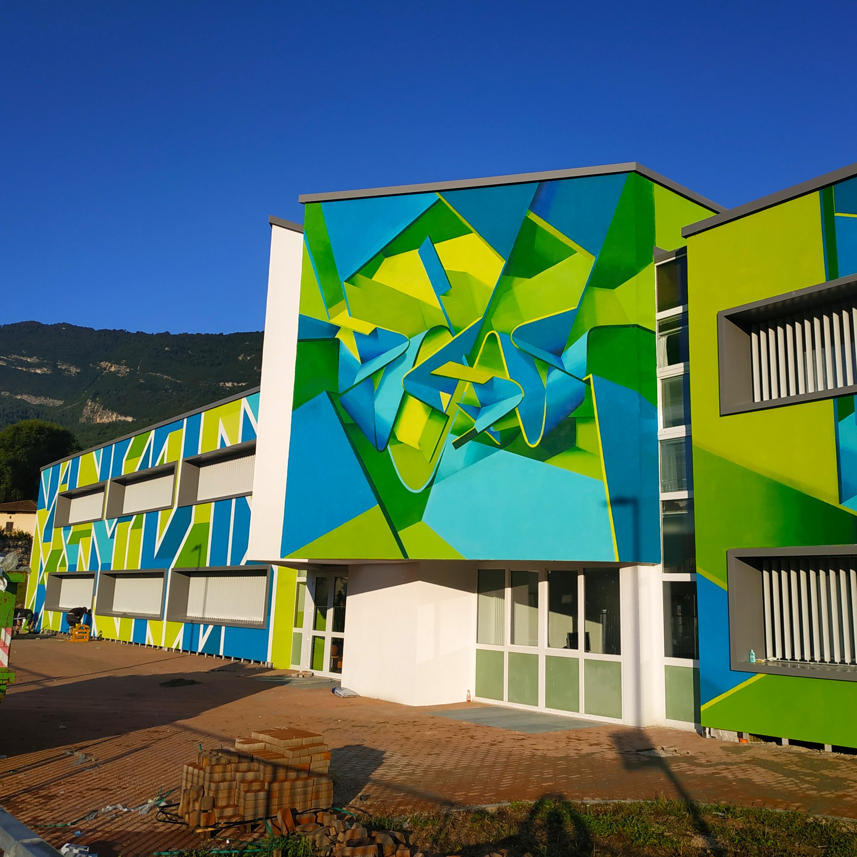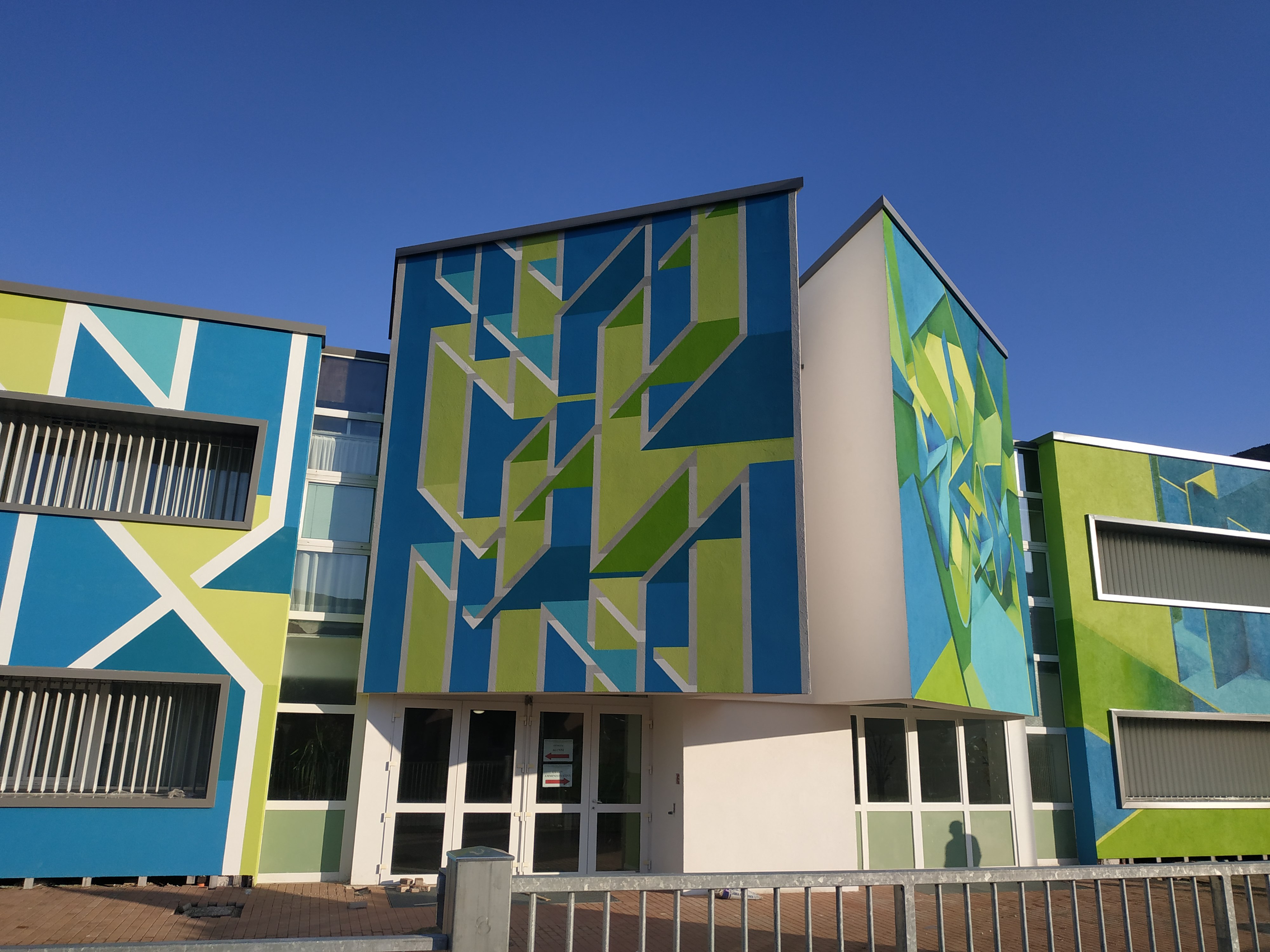 Forme geometriche, apparentemente semplici ma che vogliono penetrare all’interno dell’edificio stesso. Bel messaggio! Niente di più azzeccato per una scuola. Invita ad entrare, invita ad approfondire come lo evidenzia il colore più profondo in prossimità dell’angolo delle geometrie tridimensionali e non solo semplici ombre per via della prospettiva.