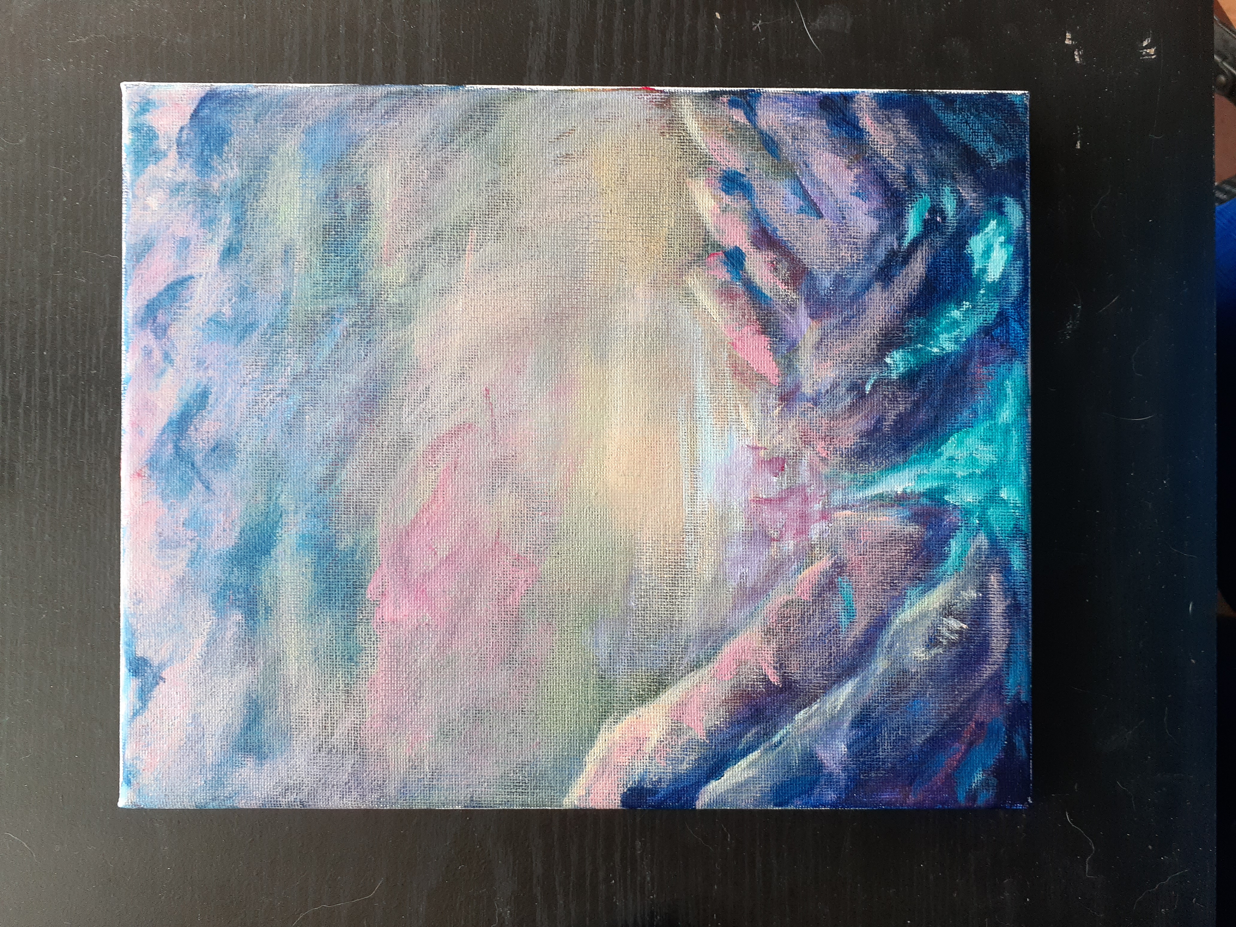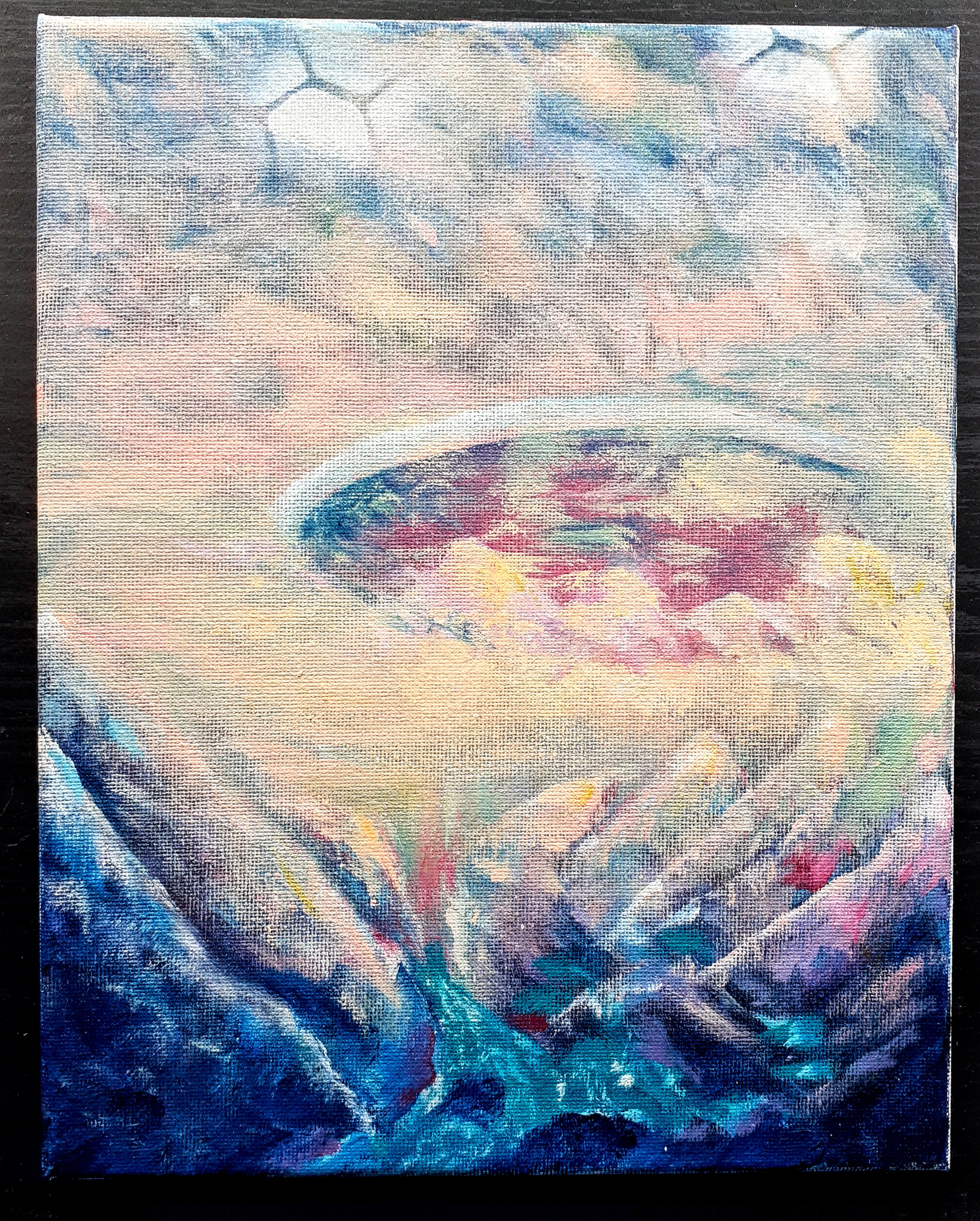 This piece is a study of the scumbling technique which is basically using a dry brush with heavy body paints and then essentially scraping and scrubbing the paint to create layers of depth. I then used a few of my regular techniques on top. Im working on popping in a subtle ufo but still not done..pretty close to being done though.