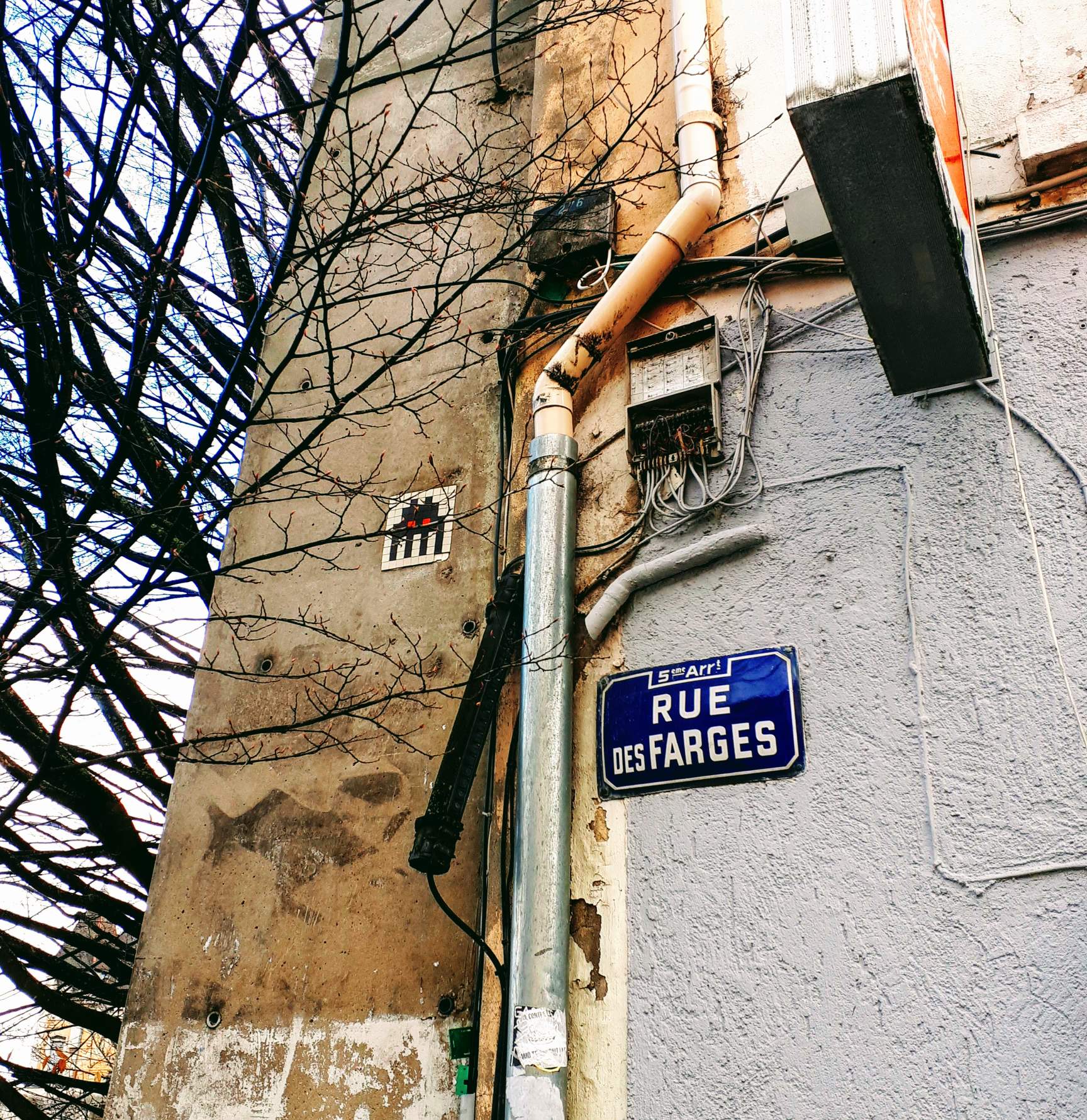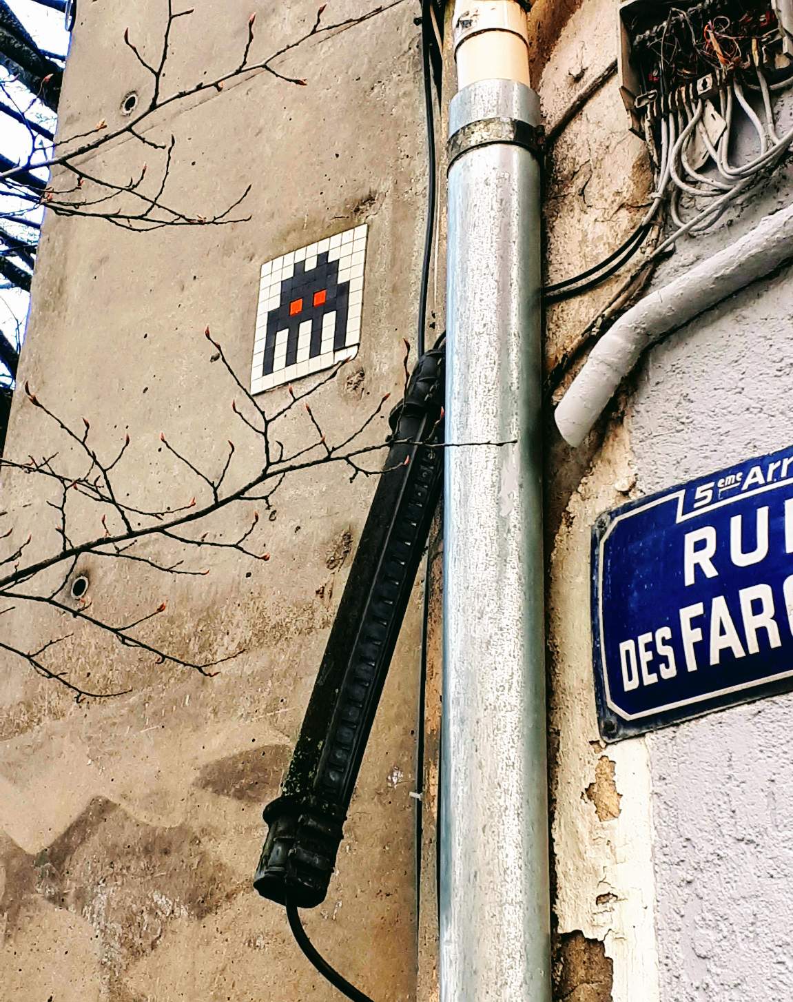 In a different part of the city, located at the top of the hill, I saw this space invader hidden behind some tree branches. In the spring and summer it's probably completely hidden by the trees leaves.