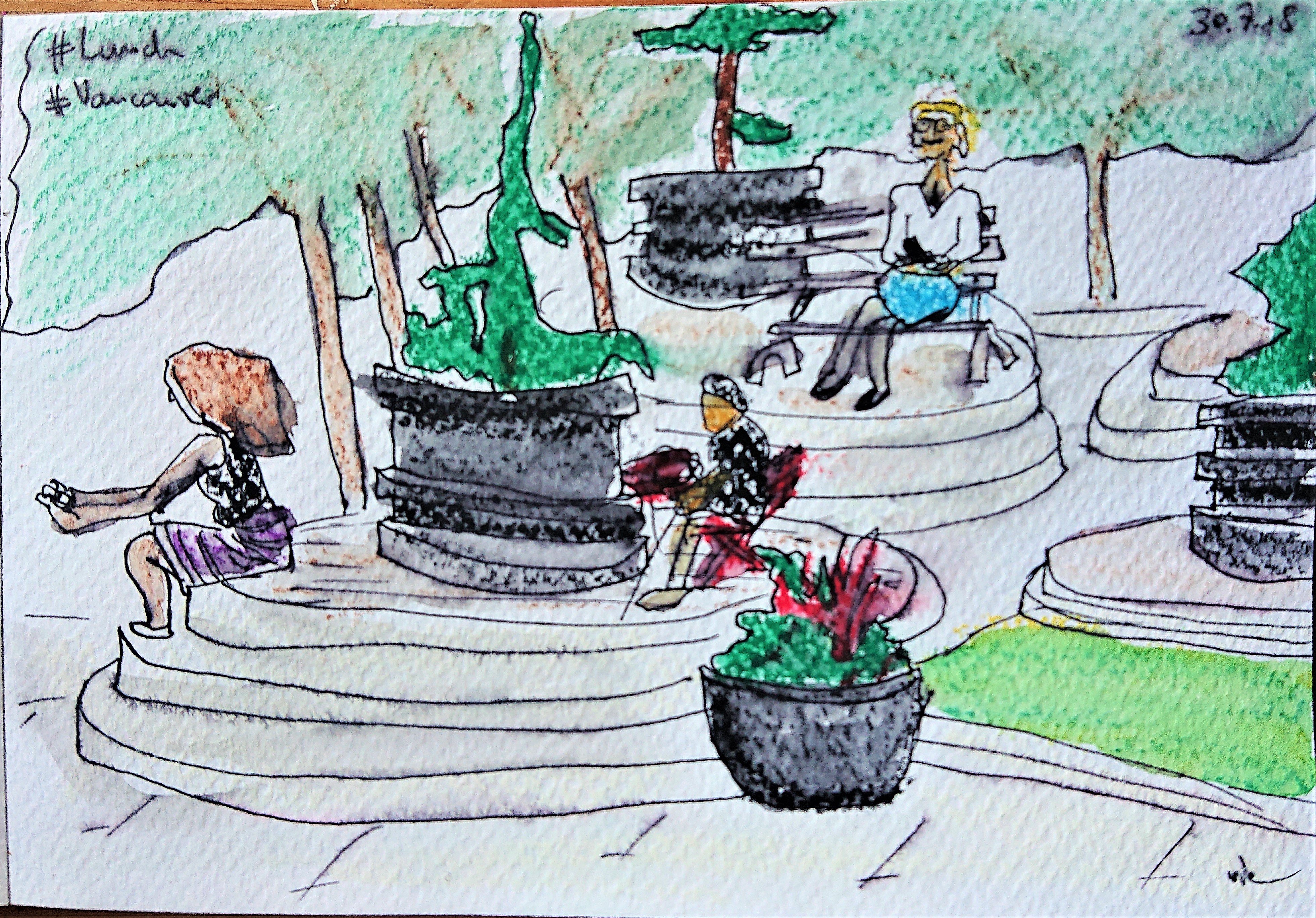 I drew this on my first day in Vancouver. I had an overnight flight from Tokyo and was pretty jetlagged, but to early to check into my room. So I went for a walk just around the neighborhood and guess what I found. Just the perfect spot for lunch. Lots of chairs and benches, a lovely atmosphere and people all over eating their food before returning to work. Did I mention that I love Vancouver?
