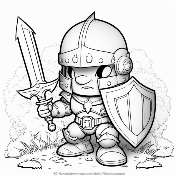 PROMT: "black and white coloring page of a cartoon knight holding a sword and shield, inspired by wakfu, outlined art, flat shading, lineart, heavyarmor, childs drawing, chibi --v 4"