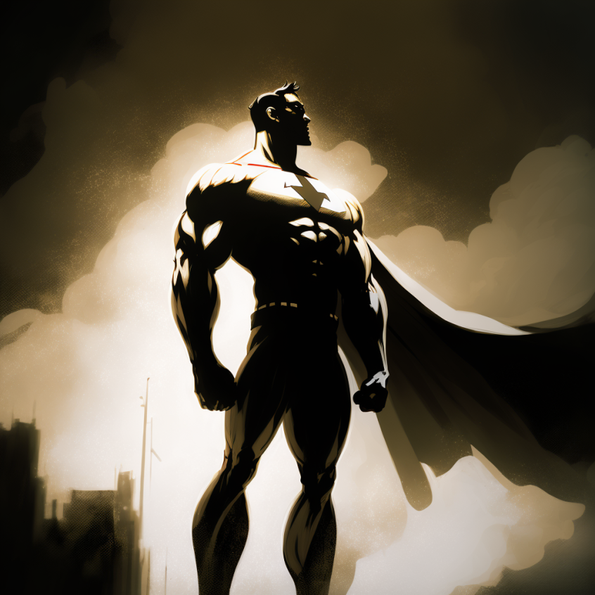 PROMT: "low angle of a superhero standing tall with high contrast lighting from one side, looking into the horizon"