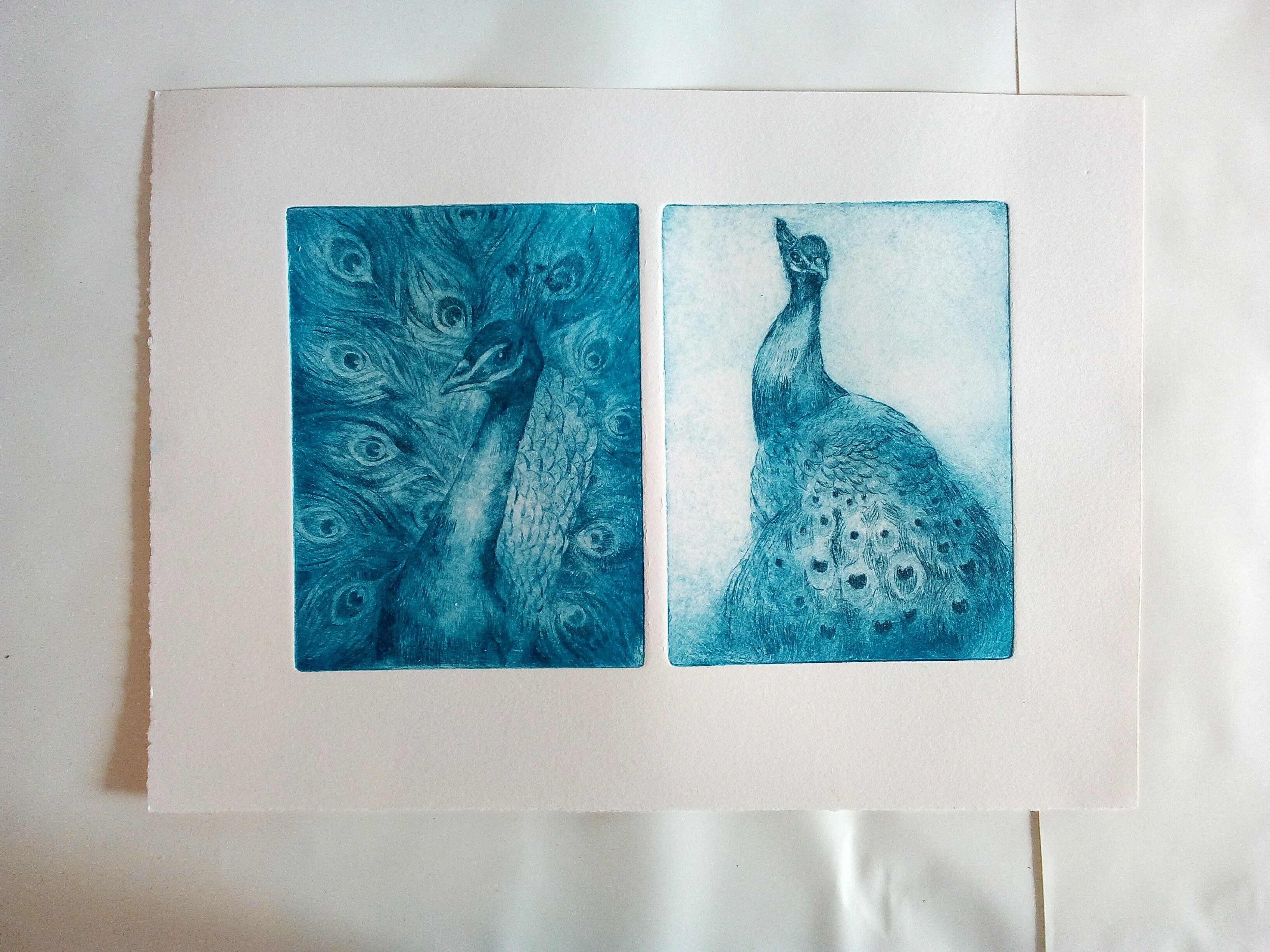 Peacock 1 & 2 printed on Fabriano paper in a cream color. Plate size 15 x 20 cm, paper size A3.