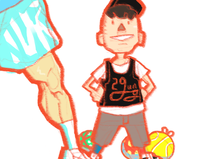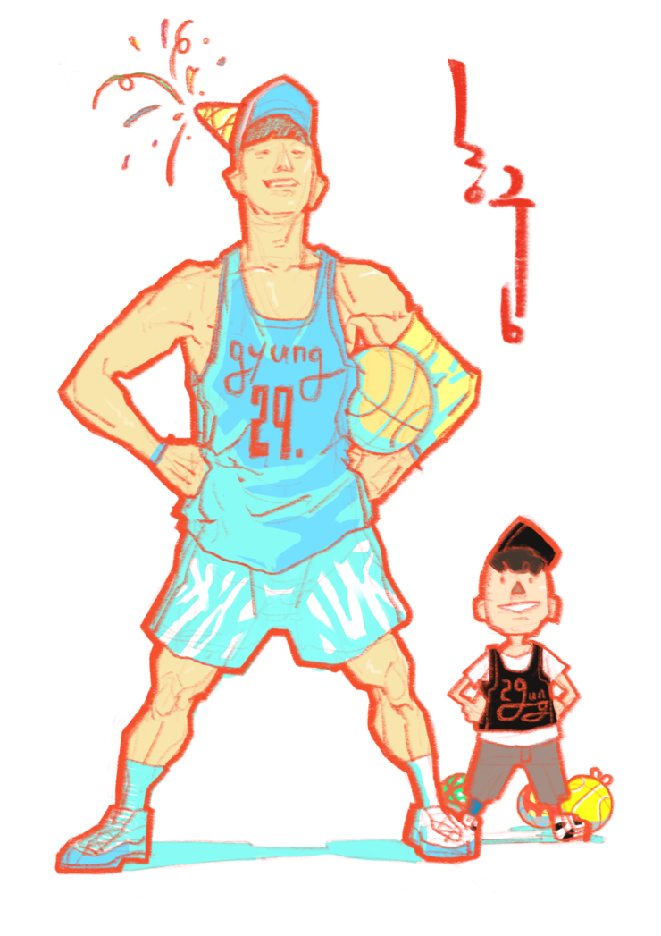 농구를 좋아하는 애라서 농구복장으로 그리고 옆에는 그 애 캐릭터로 하나더 그려 넣어줬습니다