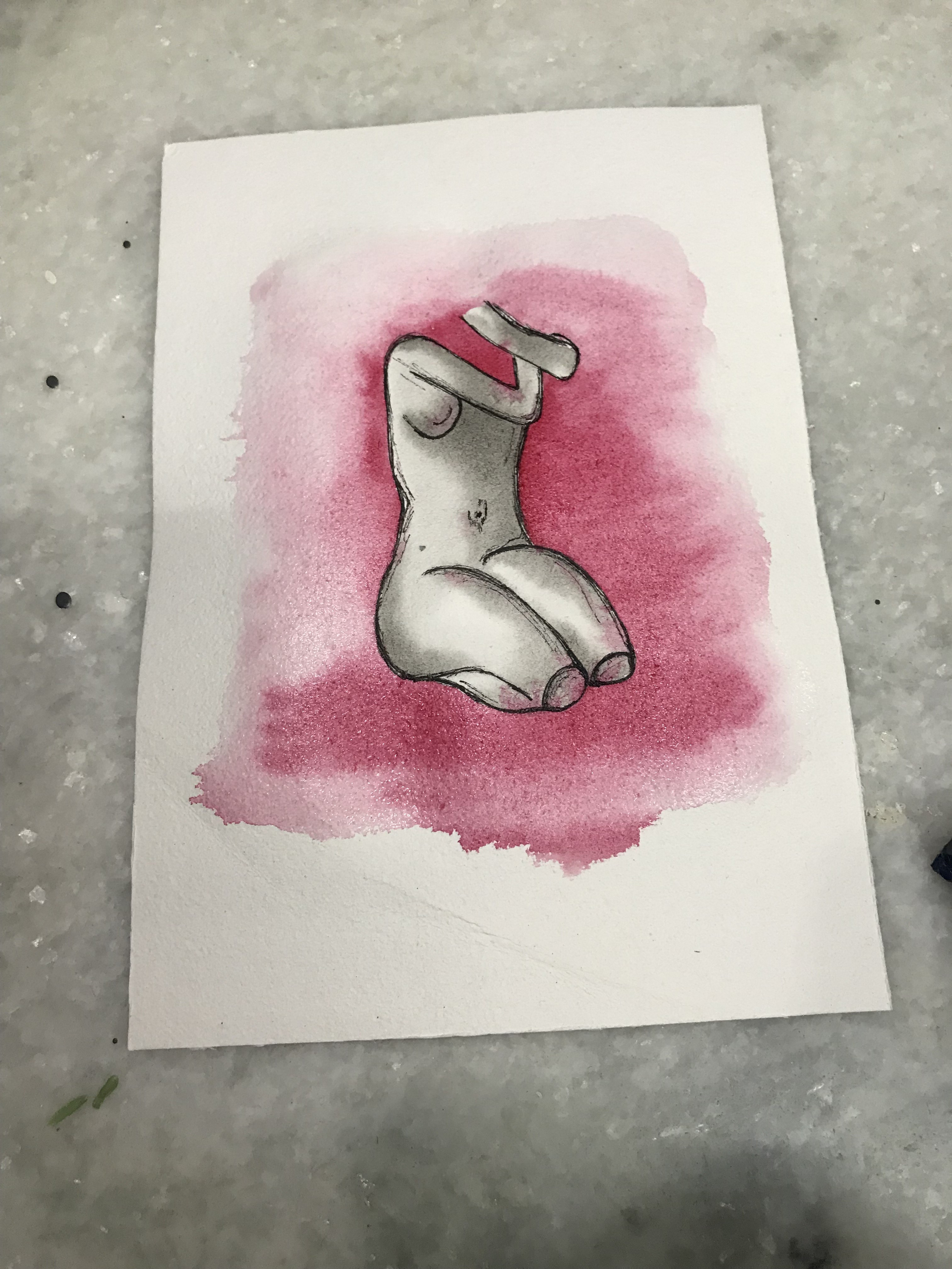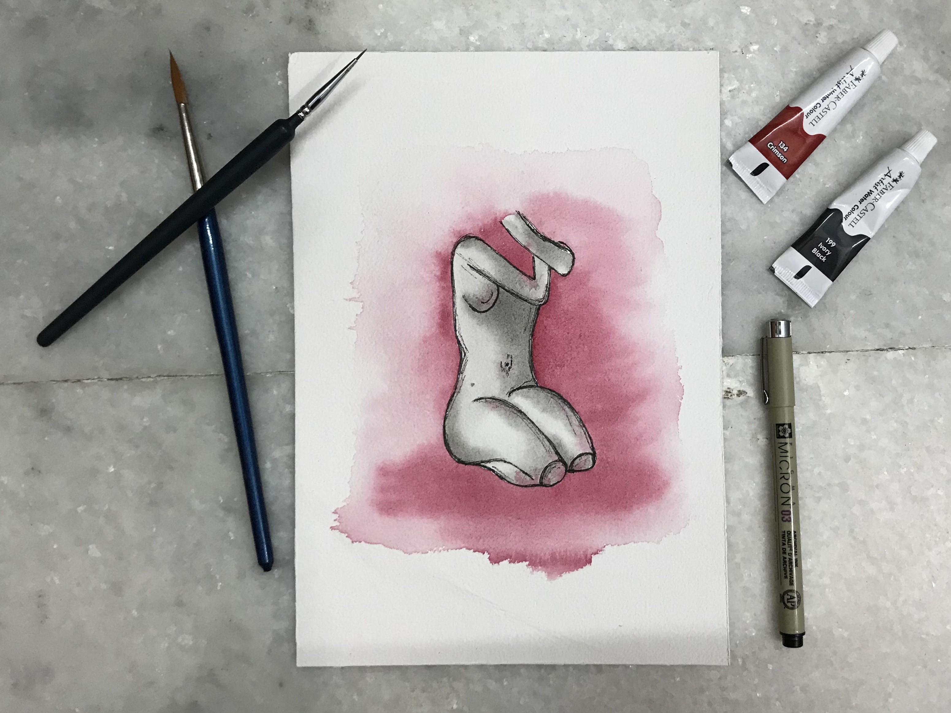 Watercolor paper as a base. Pencil for the basic outline. Very less use of an eraser. Shades of crimson and black from Faber-castell. Micron-pen 0.5 for the outline.