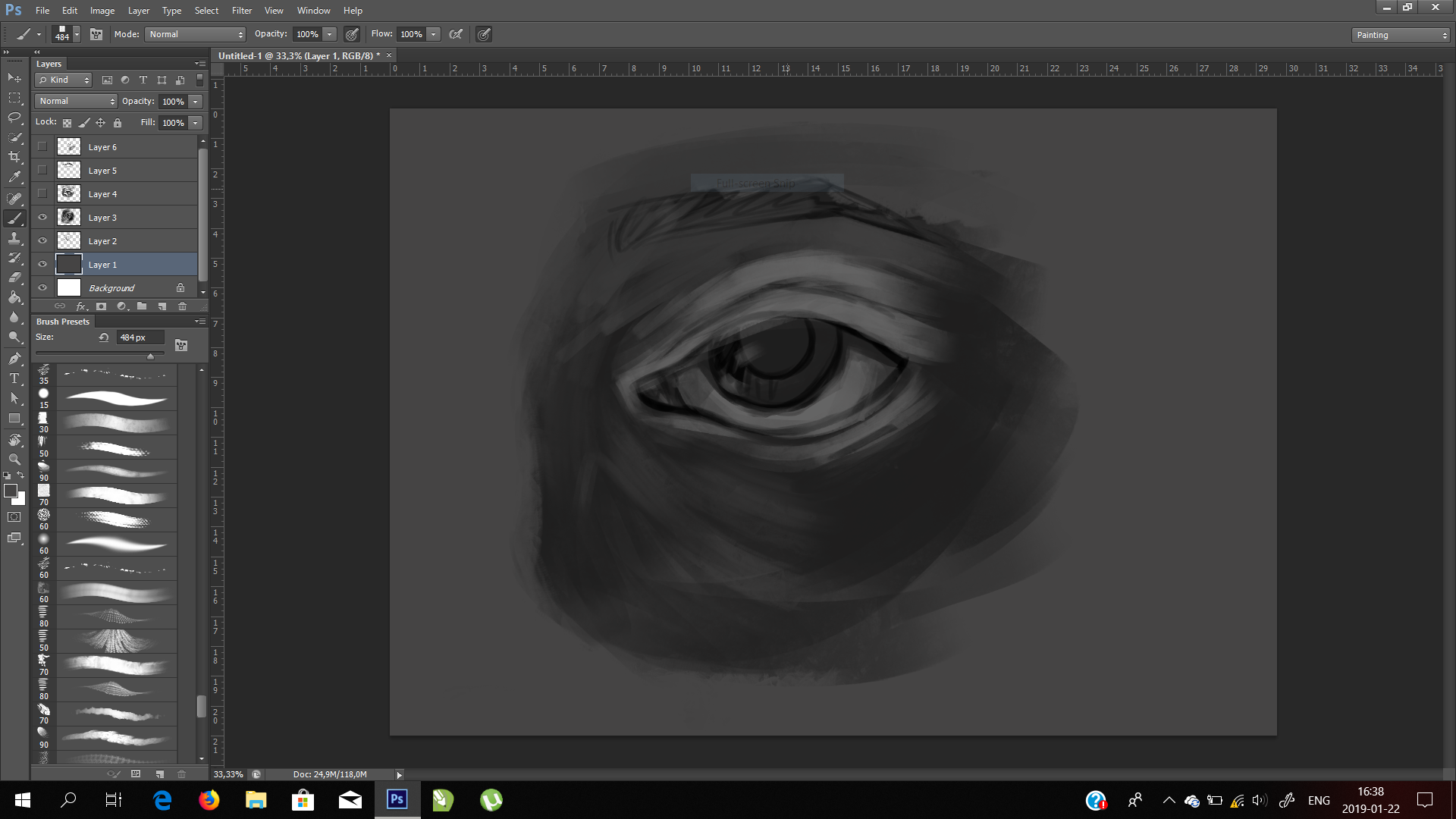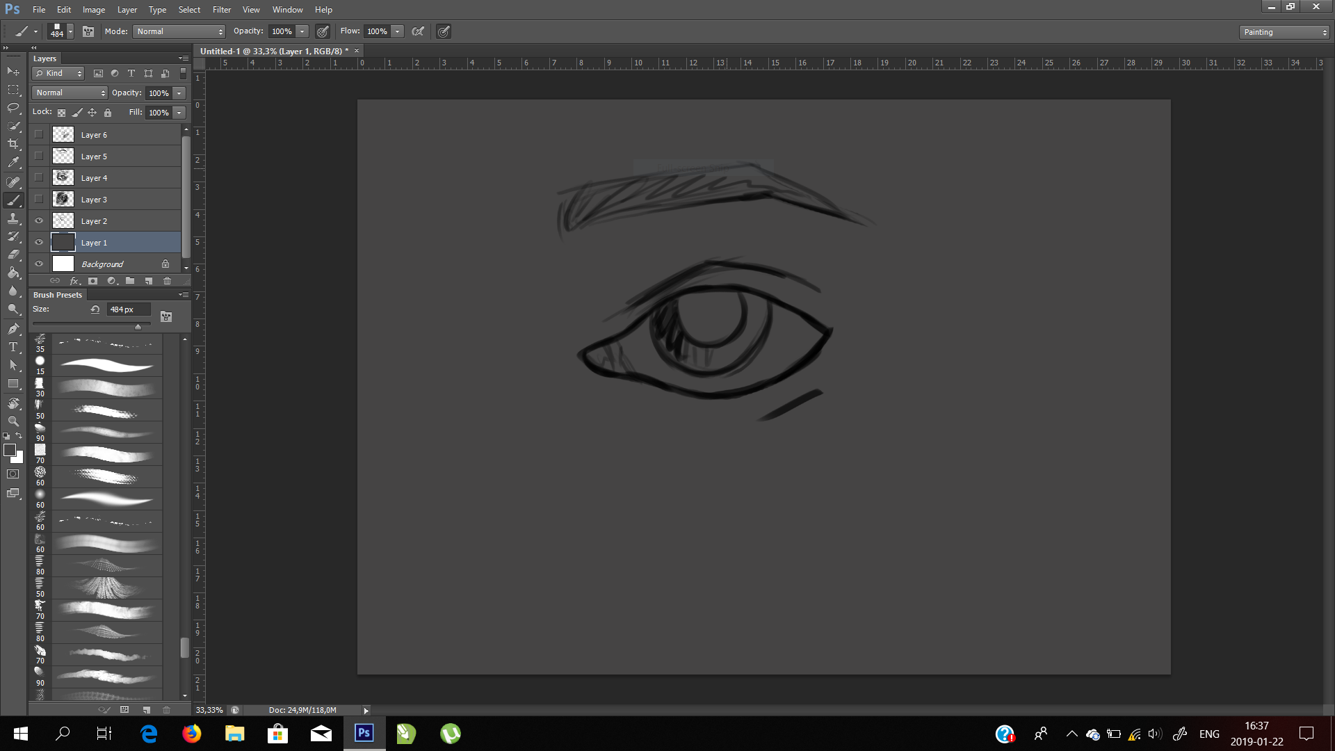 First, I started with gray background just as a base color of the face. Then I made a simple sketch of the eye and brow , I wasn't really bothered with this part because in the end sketch is removed, but sometimes I like to leave it just because it can give a little more depth if the drawing is a bit transparent.