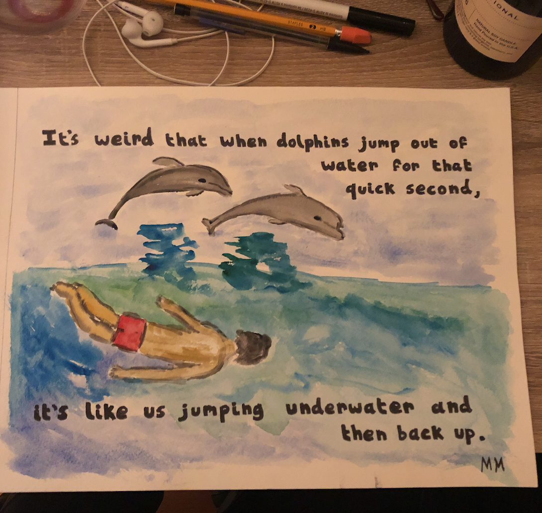 meme art 12: it's weird that when dolphins jump out of water for that quick second it's like us jumping underwater and then back upmikefromhere (44)in #art • 6 years ago (edited) It's weird that when dolphins jump out of water for that quick second, it's like us jumping underwater and then back up. Thanks as always Sincerely, Michael #watercolor #meme #painting #dolphins #jumping #underwater
