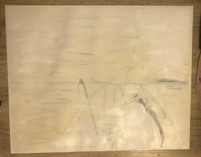 Once a basic drawing is arranged, I usually apply a very thin layer of white (or buff white) paint over the drawing to get the paper wet and covered. I do this in a way such that the pencil lines from the first step are still barely visible: