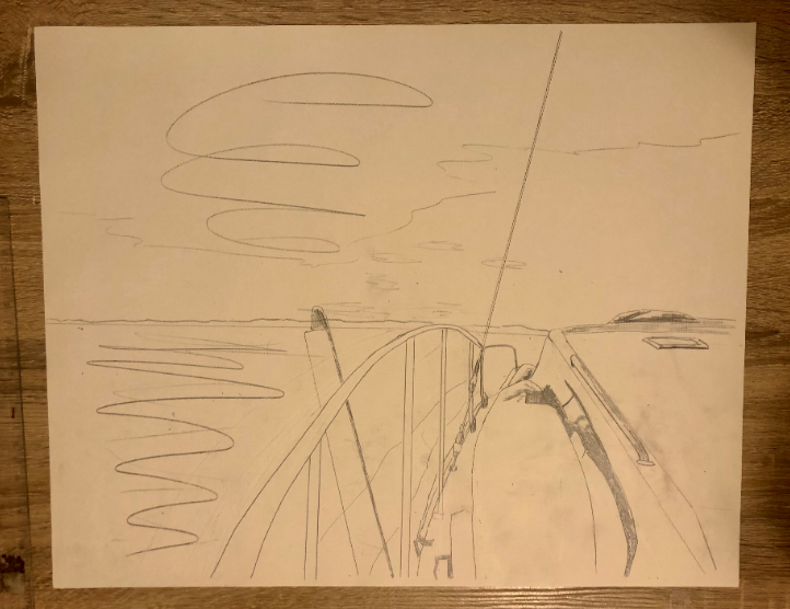 Starting with a (very) basic drawing of the scene, I had the photo up on my computer while I quickly sketched the approximate scene using a #2 pencil on my 16" x 20" canvas paper. This is just to provide the general framework from which to start painting at a later stage: