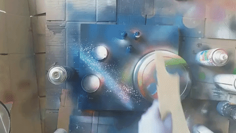 Now we will paint the milky way. We make long strokes with a bright blue spray. Then, with a white spray, we prick two fingers from the inside and make the stars move like on a giph.
