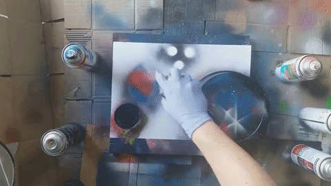 To paint our image, we need different sizes of round templates. We place them where we want our planets to be created and paint with black spray around the templates, to know where the planets will be.