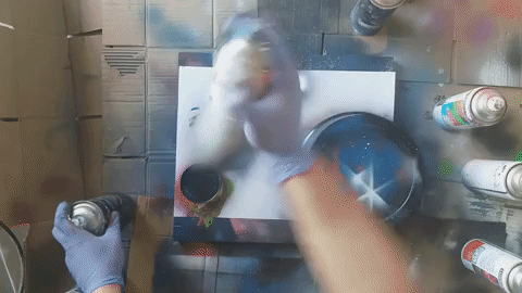 The time has come to make a background for planets. In one hand we take a black spray and the other dark blue. We paint both sprays at once.