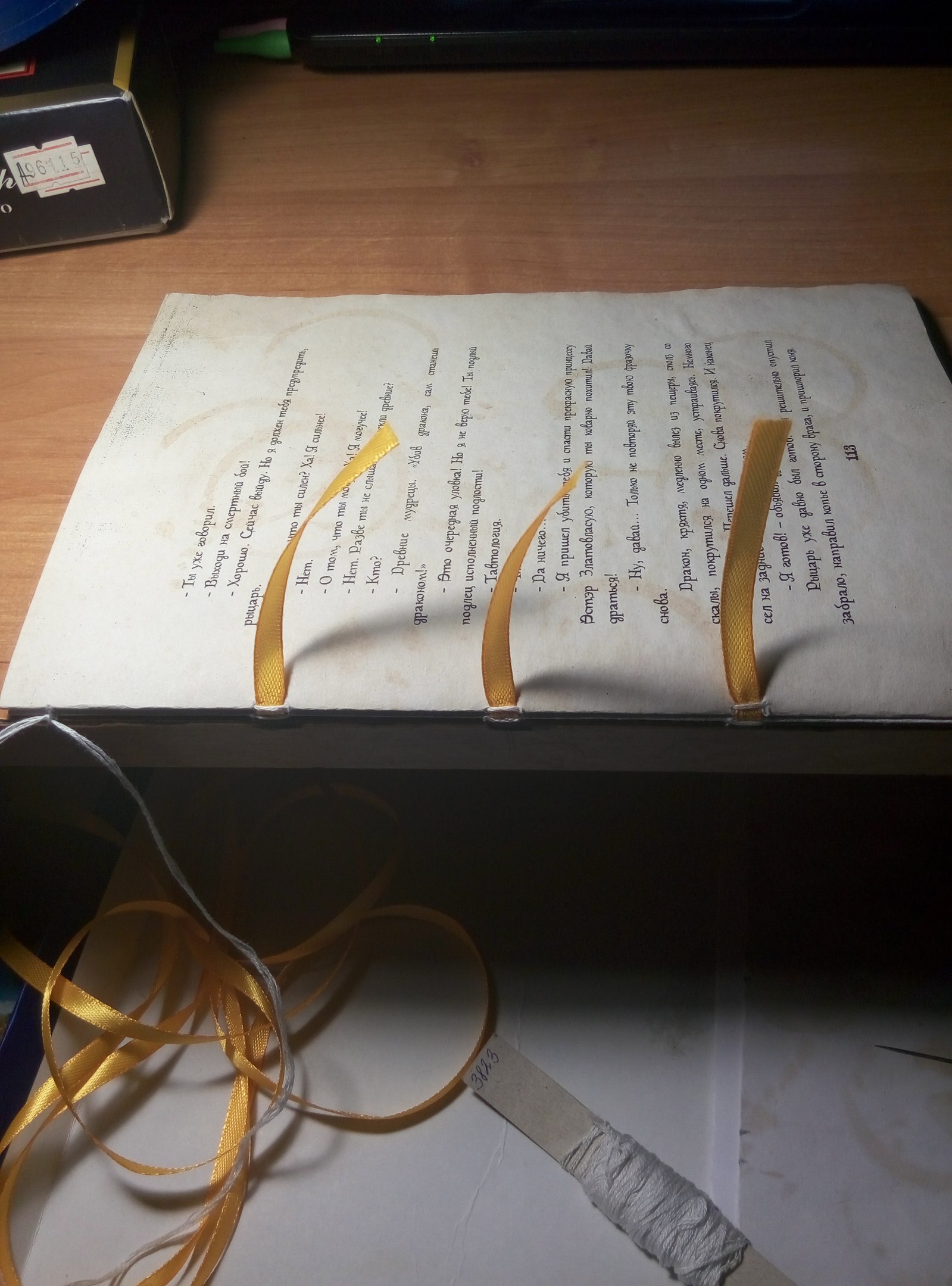 - After that I connected the book and the cover. To do this, I put the book in the cover and pasted the last pages to the cover (never glue the book's spine, only the sheets!). For beauty, you can put a ribbon to bookmark between the cover and the book.