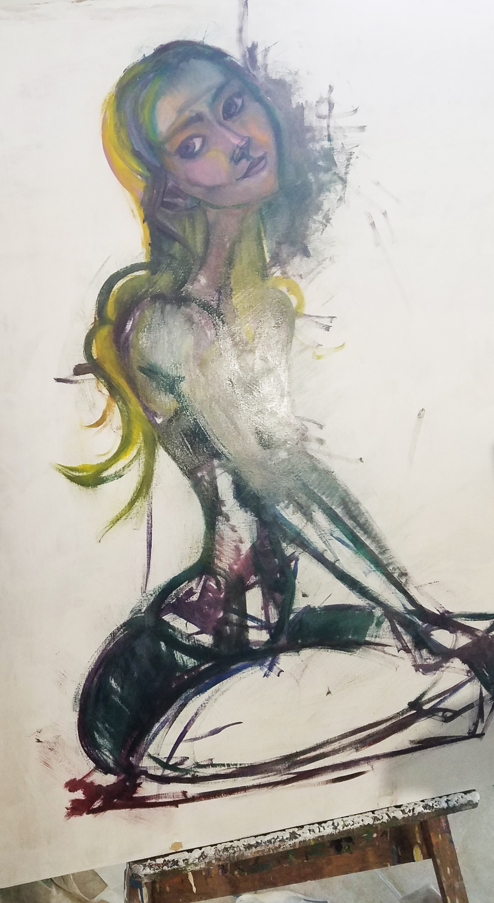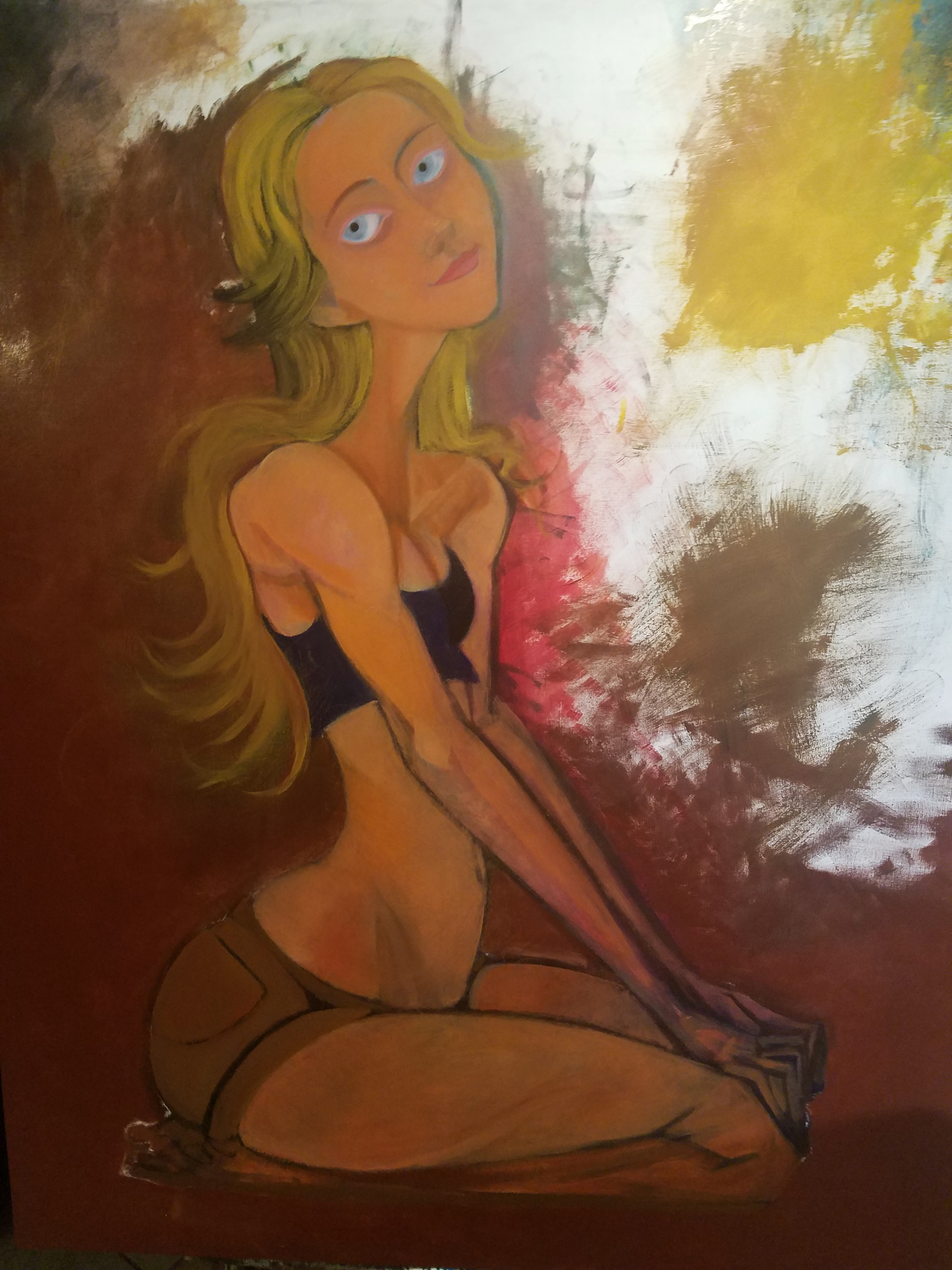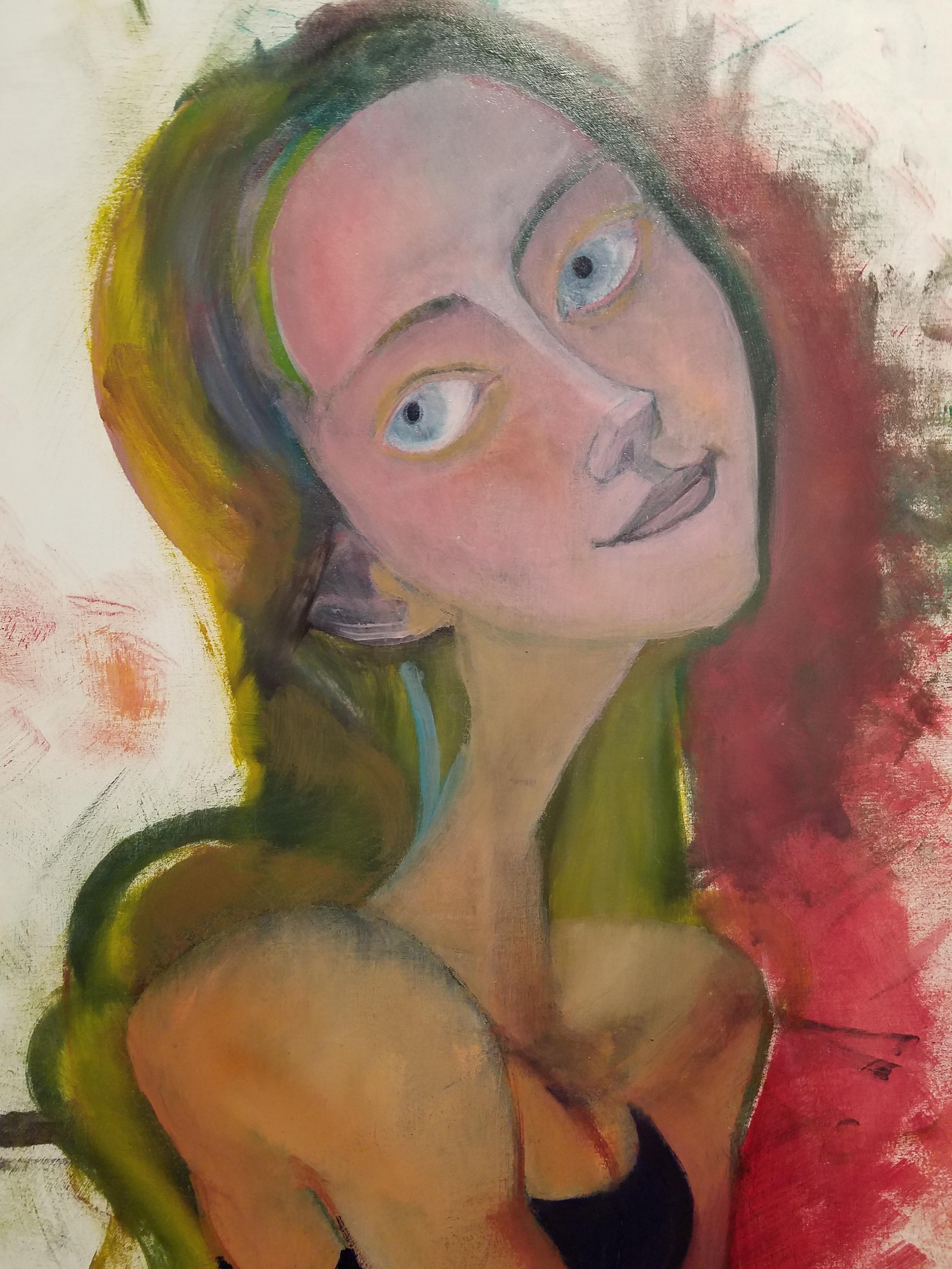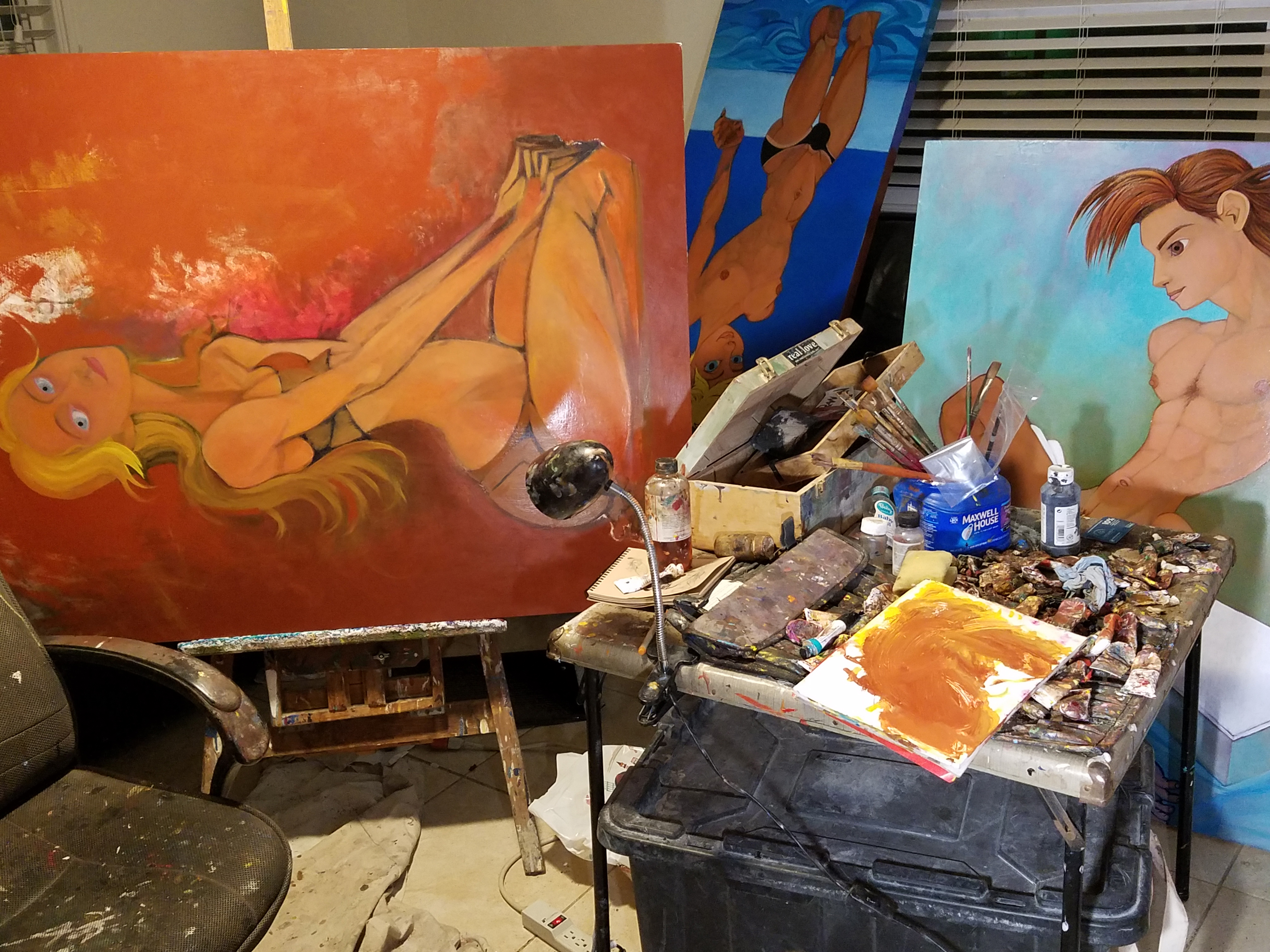 In this photo there is an upside down painting on the couch behind. "Anna". I will reveal this painting soon. It is nearly completed. Today I worked on the blond hair extensively. It needs to dry. Yellows and other cadmium colors take longer to dry. When that work was done the other color went to "Anna".