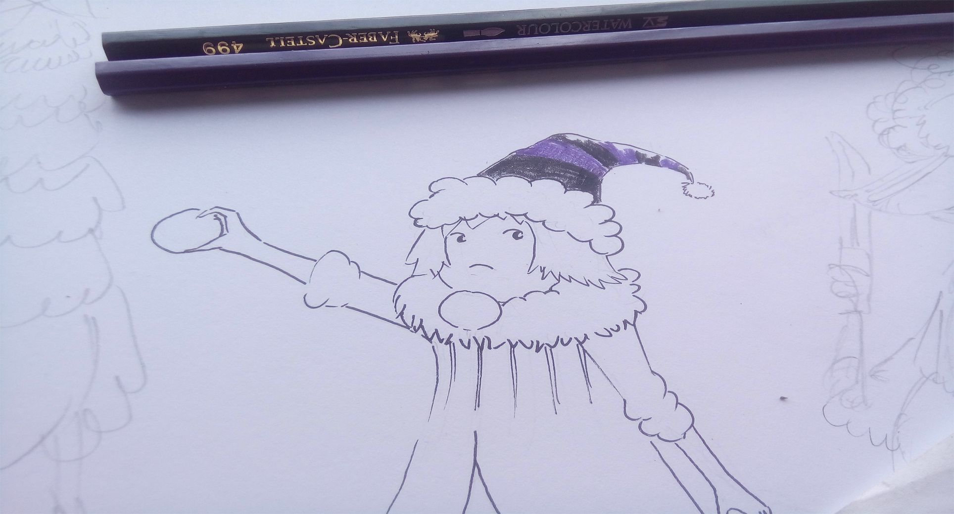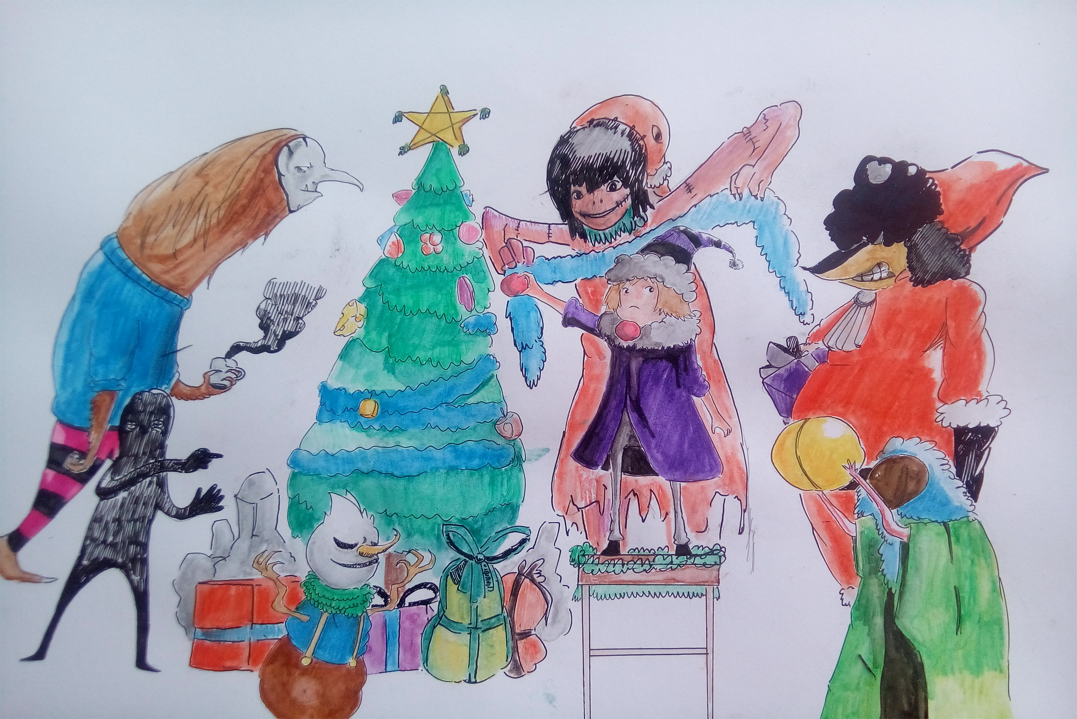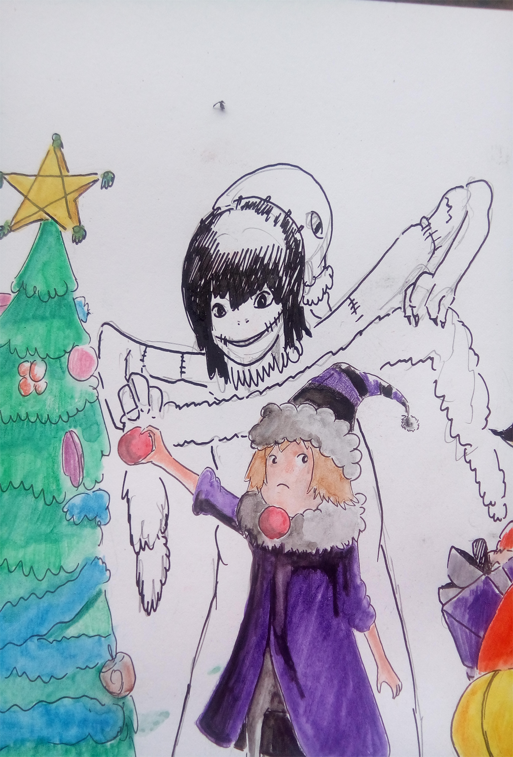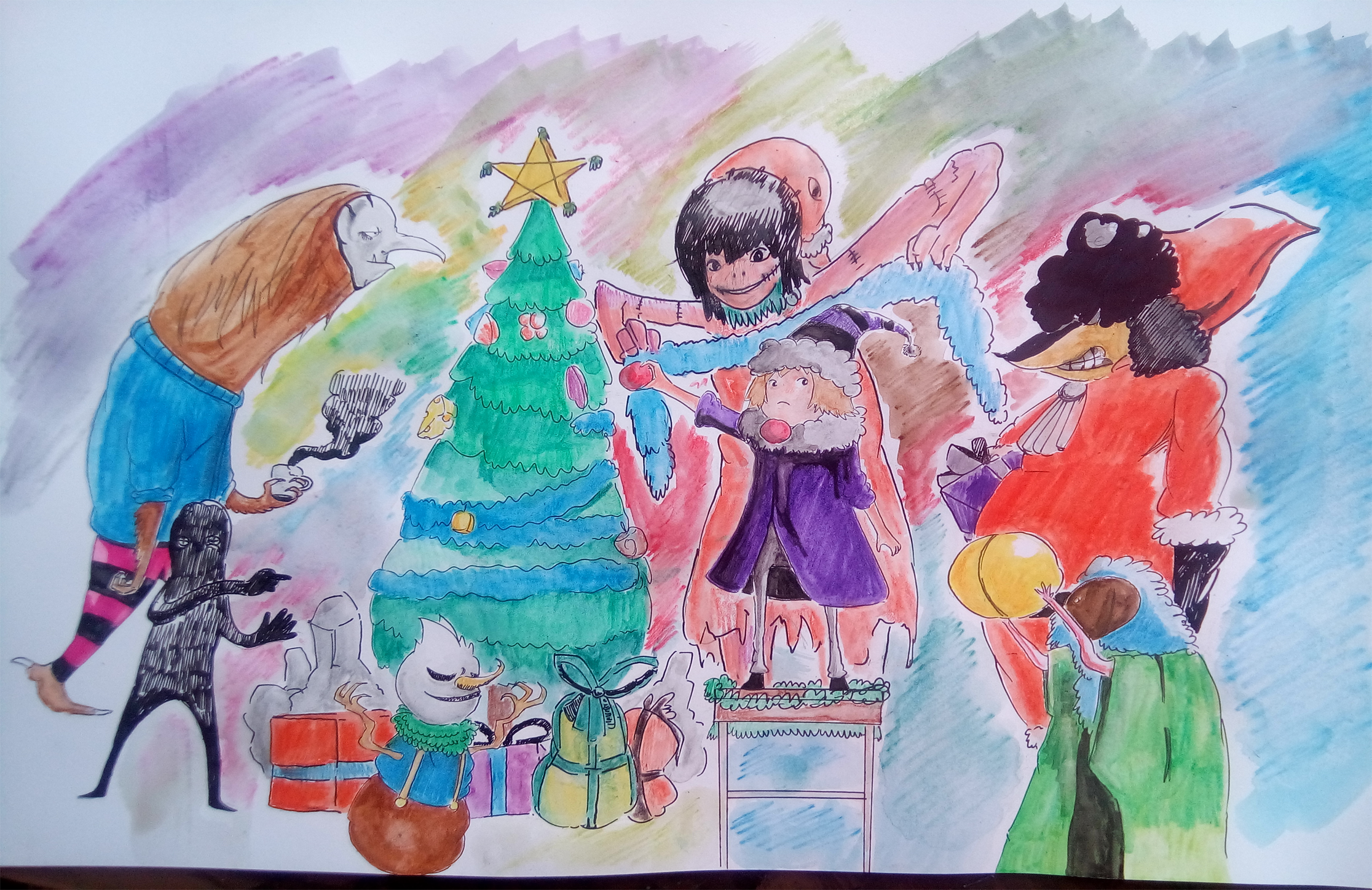 First, I made a rough draft with my mechanical pencil. When I was drafting, all I was thinking was a collection of monsters fixing a Chistmas tree. I kind of got it right with the fixing part, but not everyone is doing so. But still, I think it still looks like all of them are having fun with in this scene, so it's an okay here
