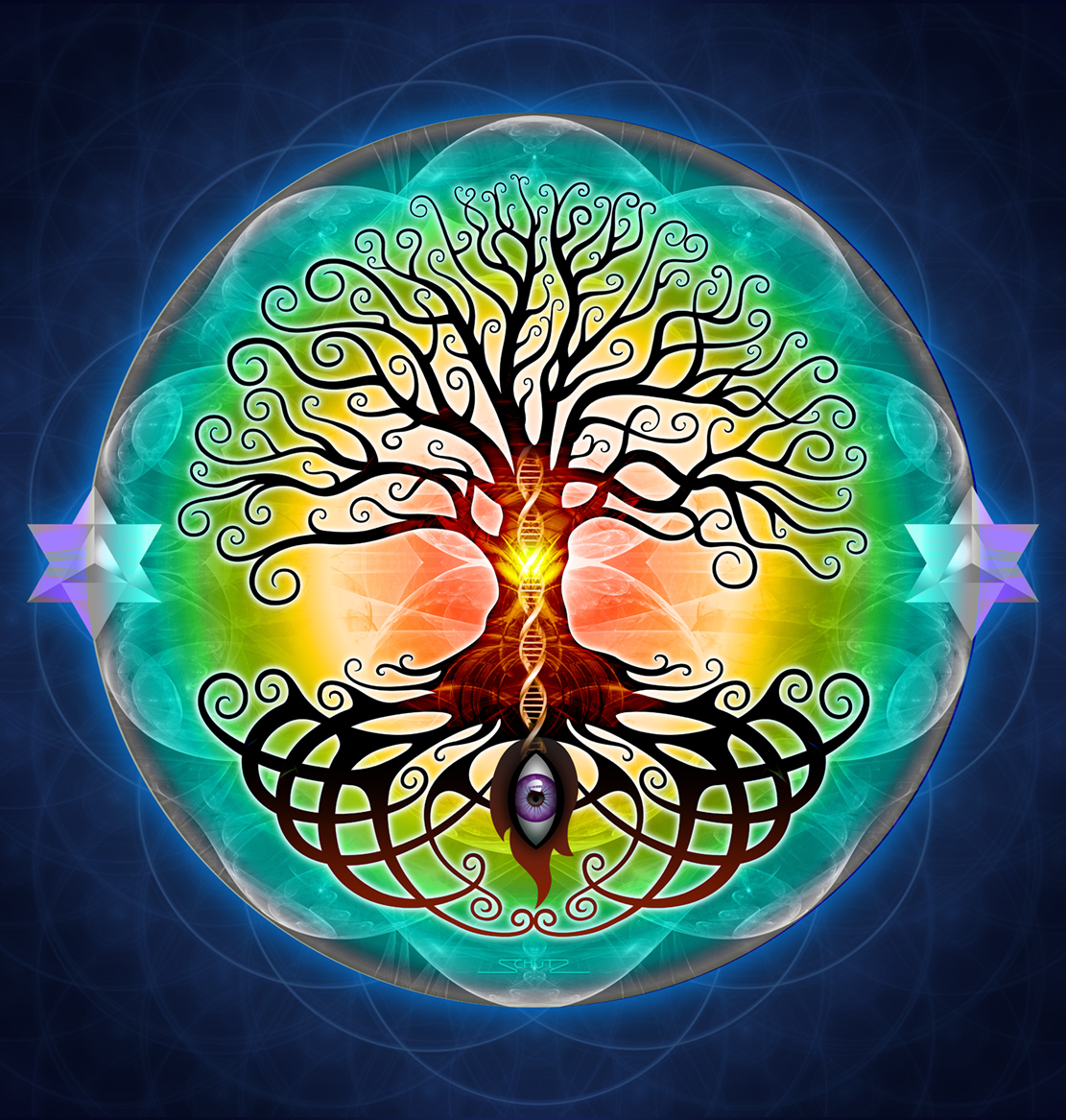 The Trees Of Life, created by yours truly, are shown first as the sacred geometry version, an ancient mystical symbol for abundance and wealth, and below that as the more traditional acacia tree.