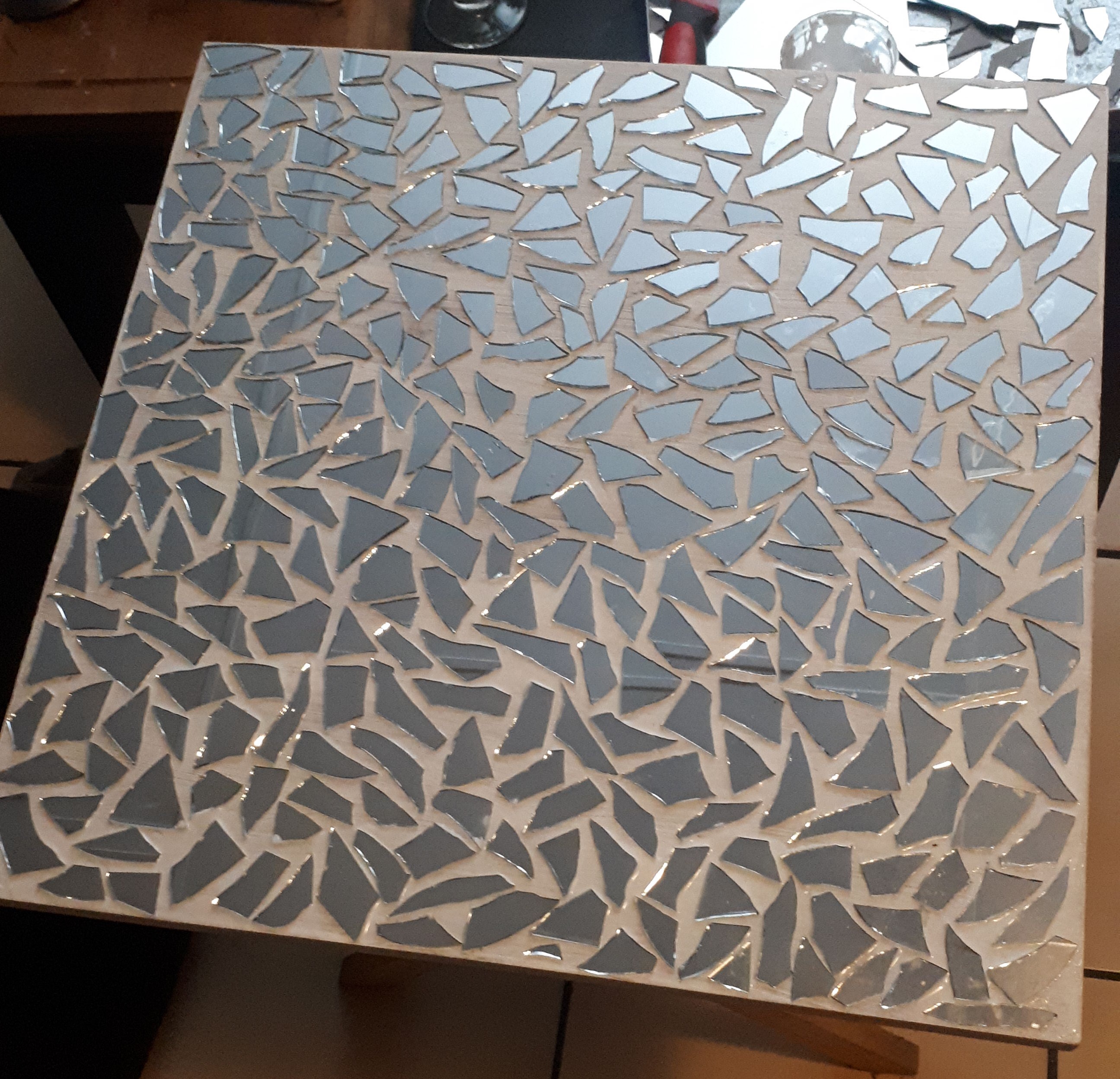 Here is our piece all picture pretty in mirror art, left it for a day to dry nice and hard before applying grout.