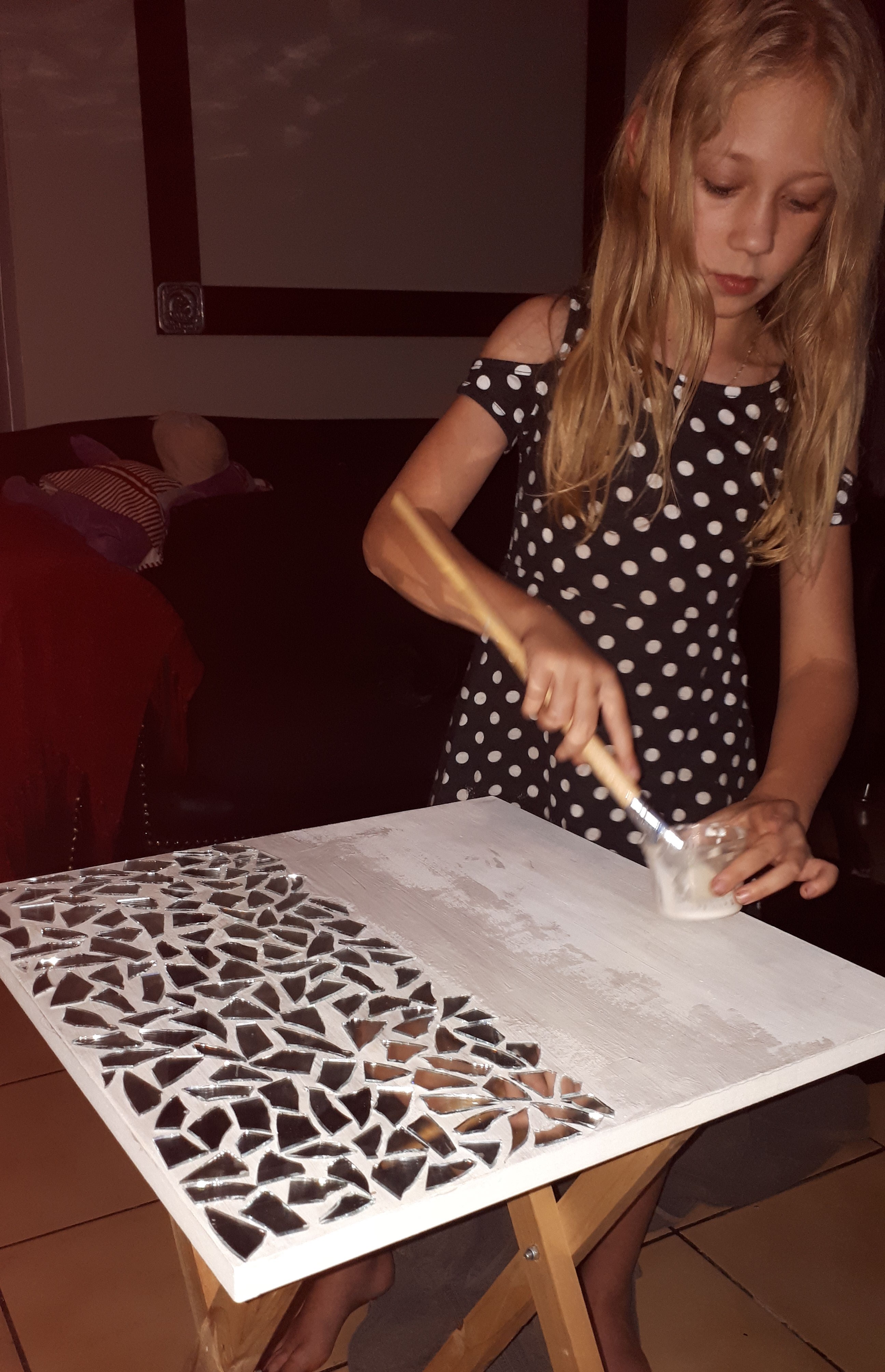 Next task was to paint the white wood/craft glue onto the table top and stick down our wacky mirror pattern (only paint a smaller section at a time to make sure your pieces stick properly in time)