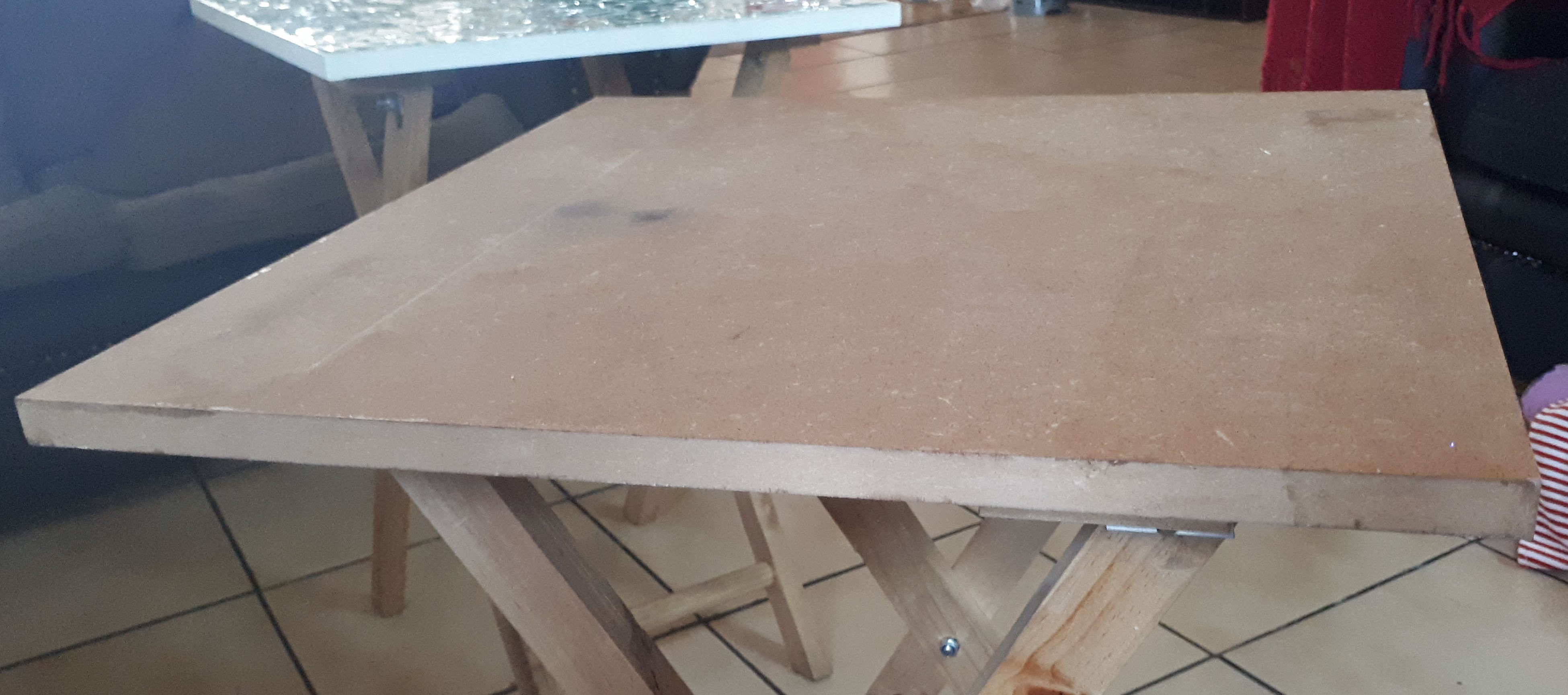I purchased these two coffee tables a few years back which I simply stuck vinyl onto the tops..
