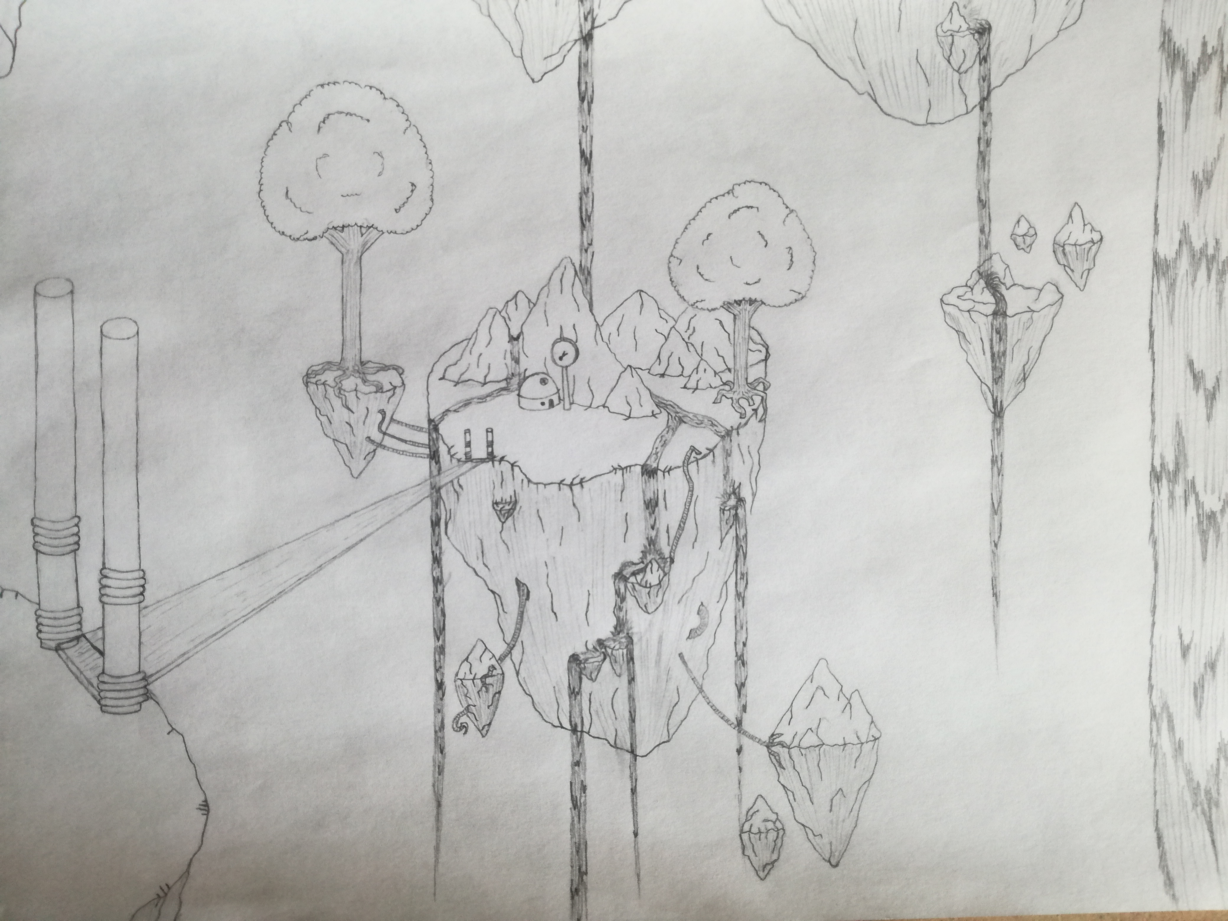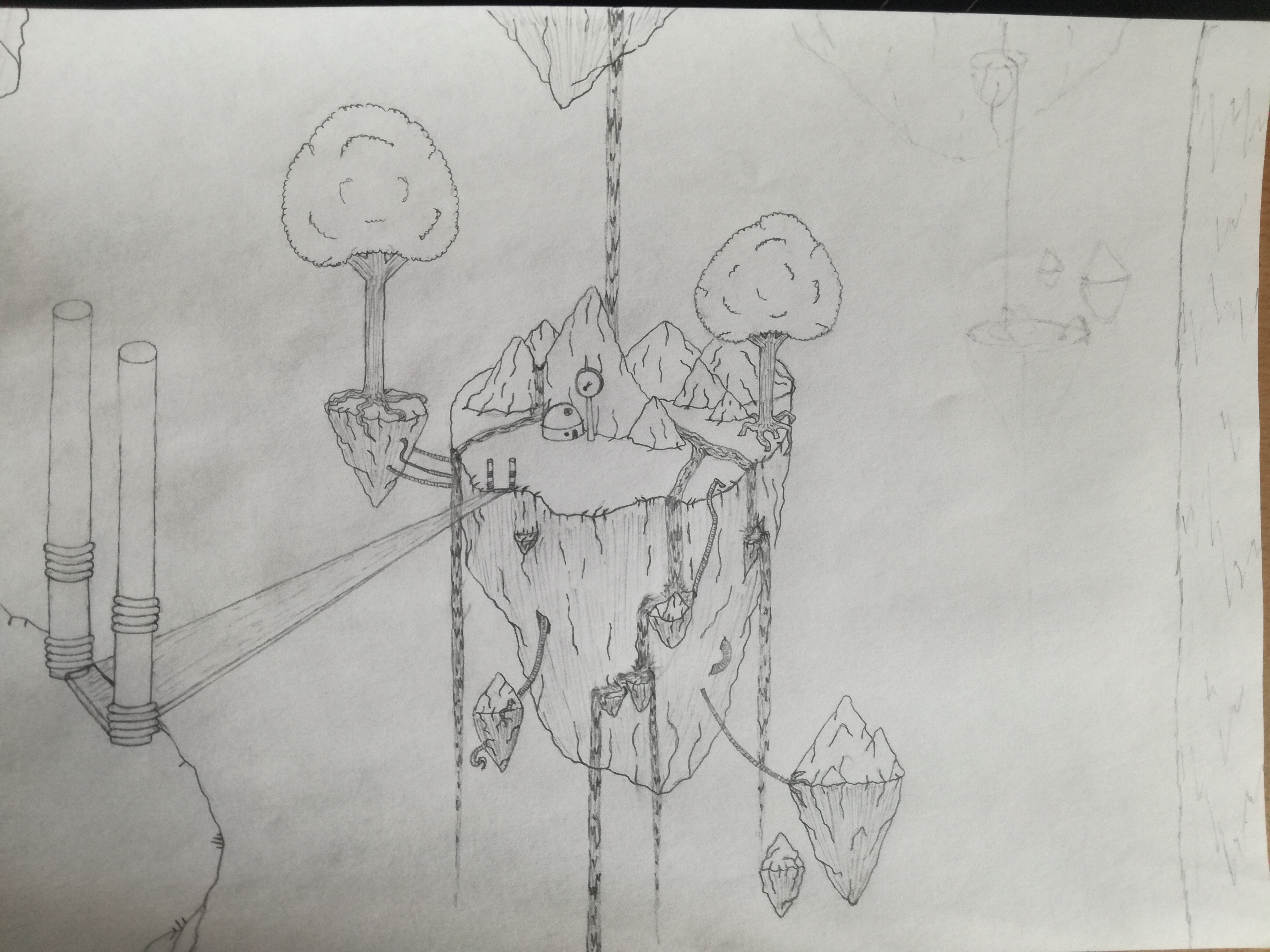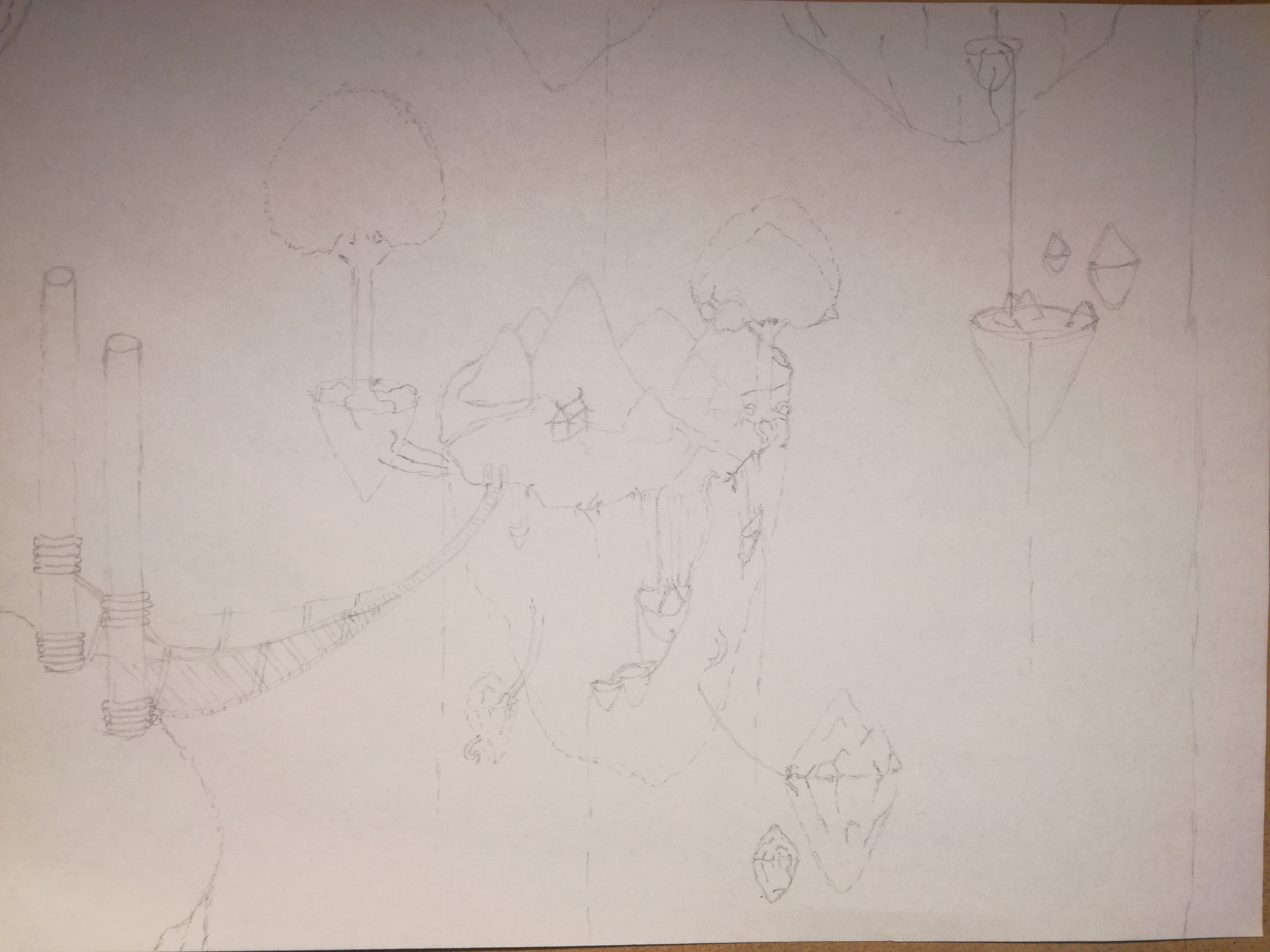 The first thing I did was draw the left edge and the centar island, also as you can see I have changed the wooden hanging bridge and the little elvish/nordic house into a energy forcefield bridge and a little futuristic sci-fi round house and an antenna dish.