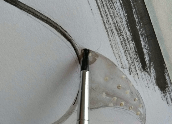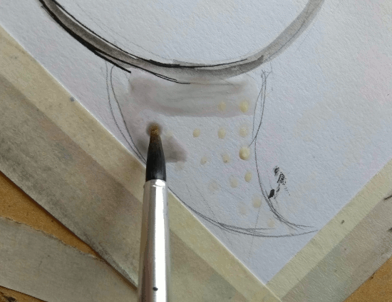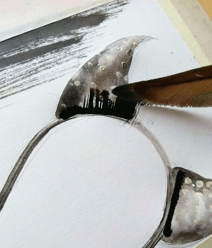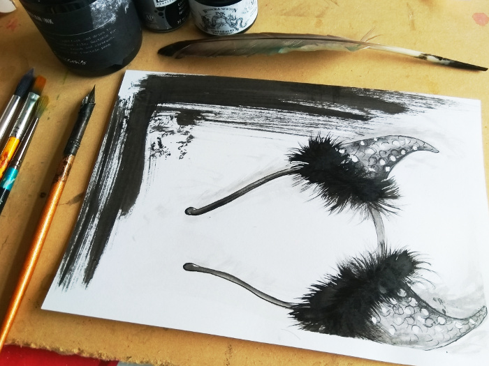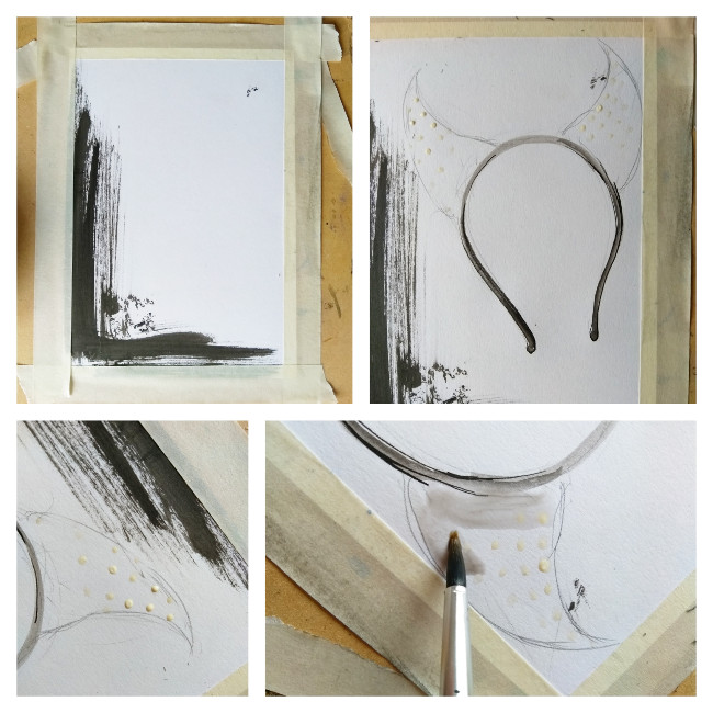 The image was drawn out in pencil, then masking fluid applied to the areas that would be the horns sequins. Once the masking fluid had dried areas of tone were built up with water and ink.