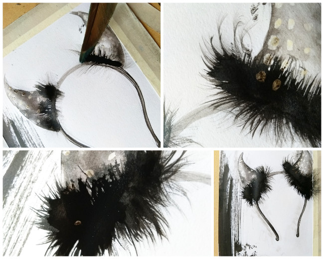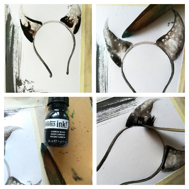 Darker tones were applied using Liquitex ink, a feather was then used to create a series of marks at the base of the horns.