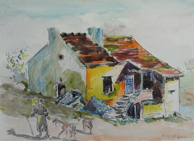 Painted in 1963 in the village of Fley - Small houses like this one are those of very poor people. They are often isolated, built on a slope and partially buried. The roof does not cover the stairs and there is no gallery/porch.