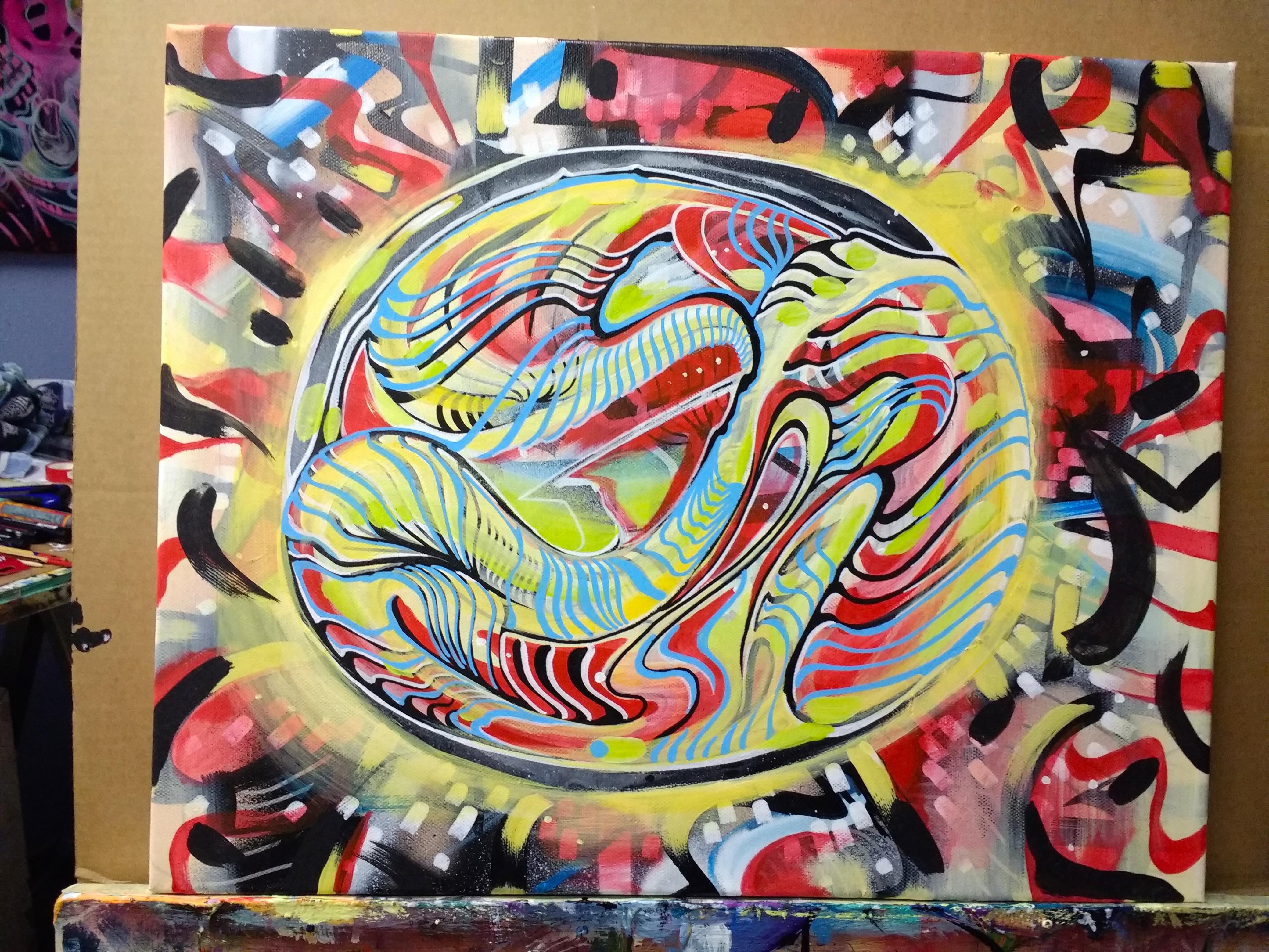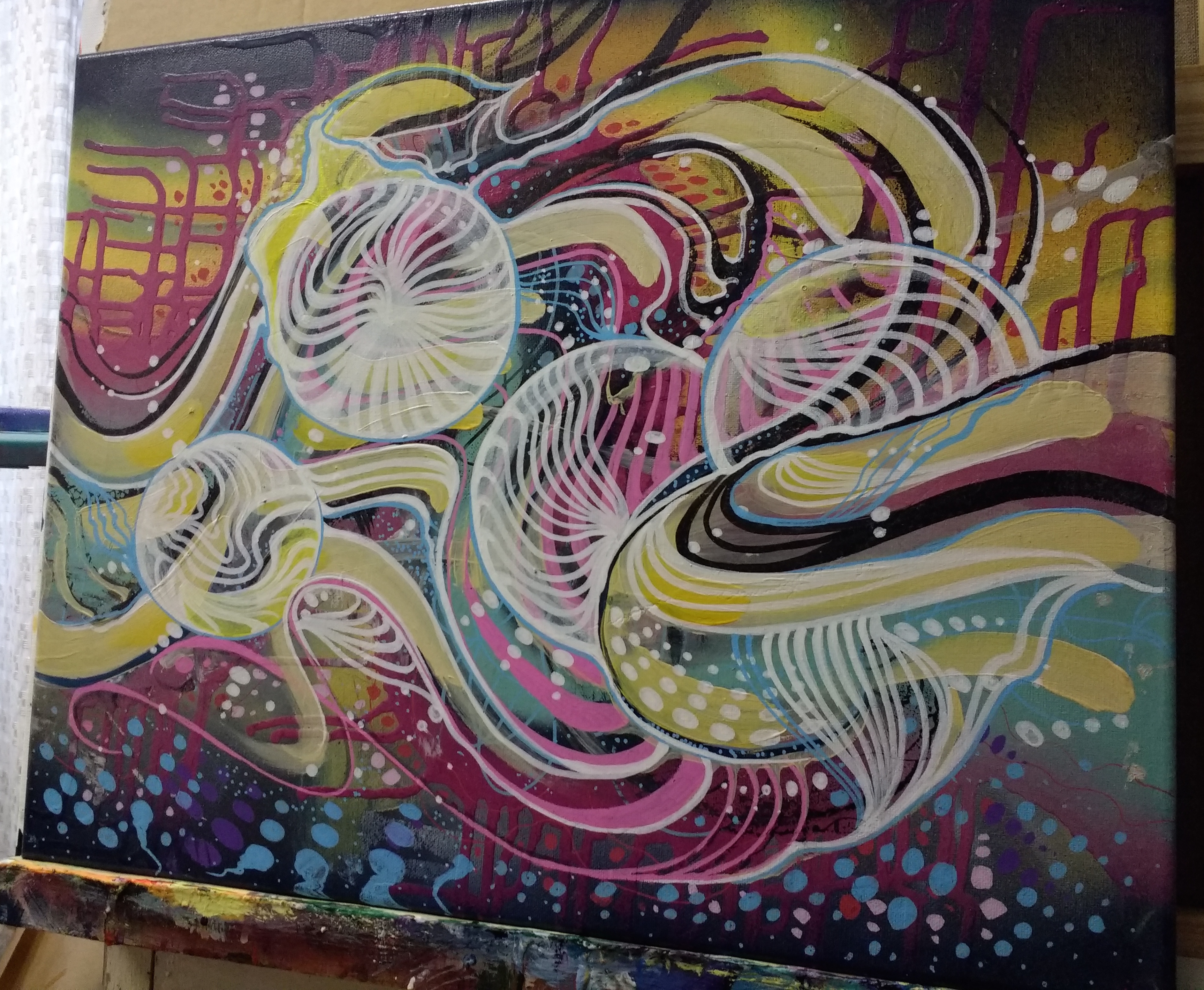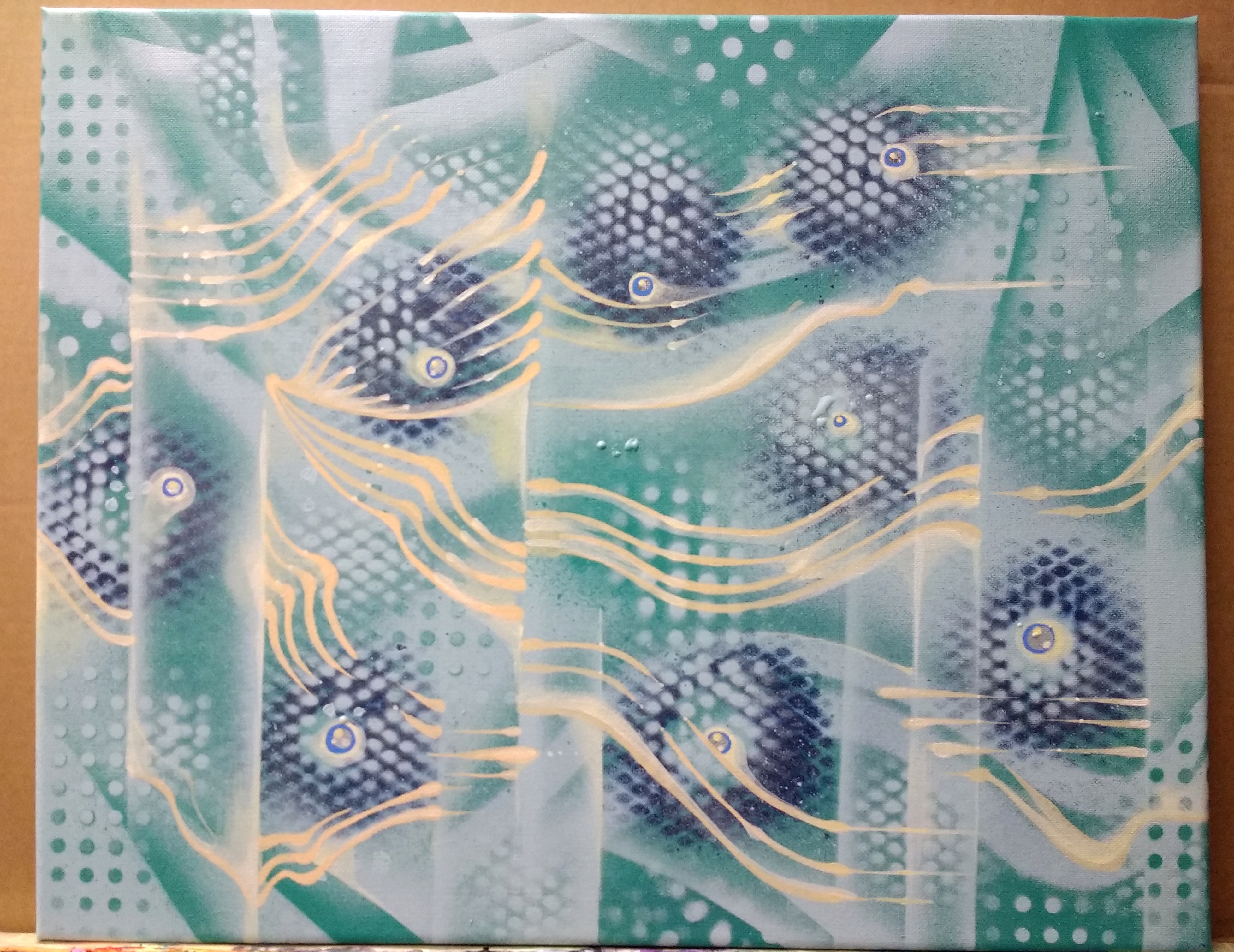 I like to experiment with paint and work in many layers. For these paintings I used spraypaint and acrylic paints applied with brushes, I also use artmarkers for the fine lines.