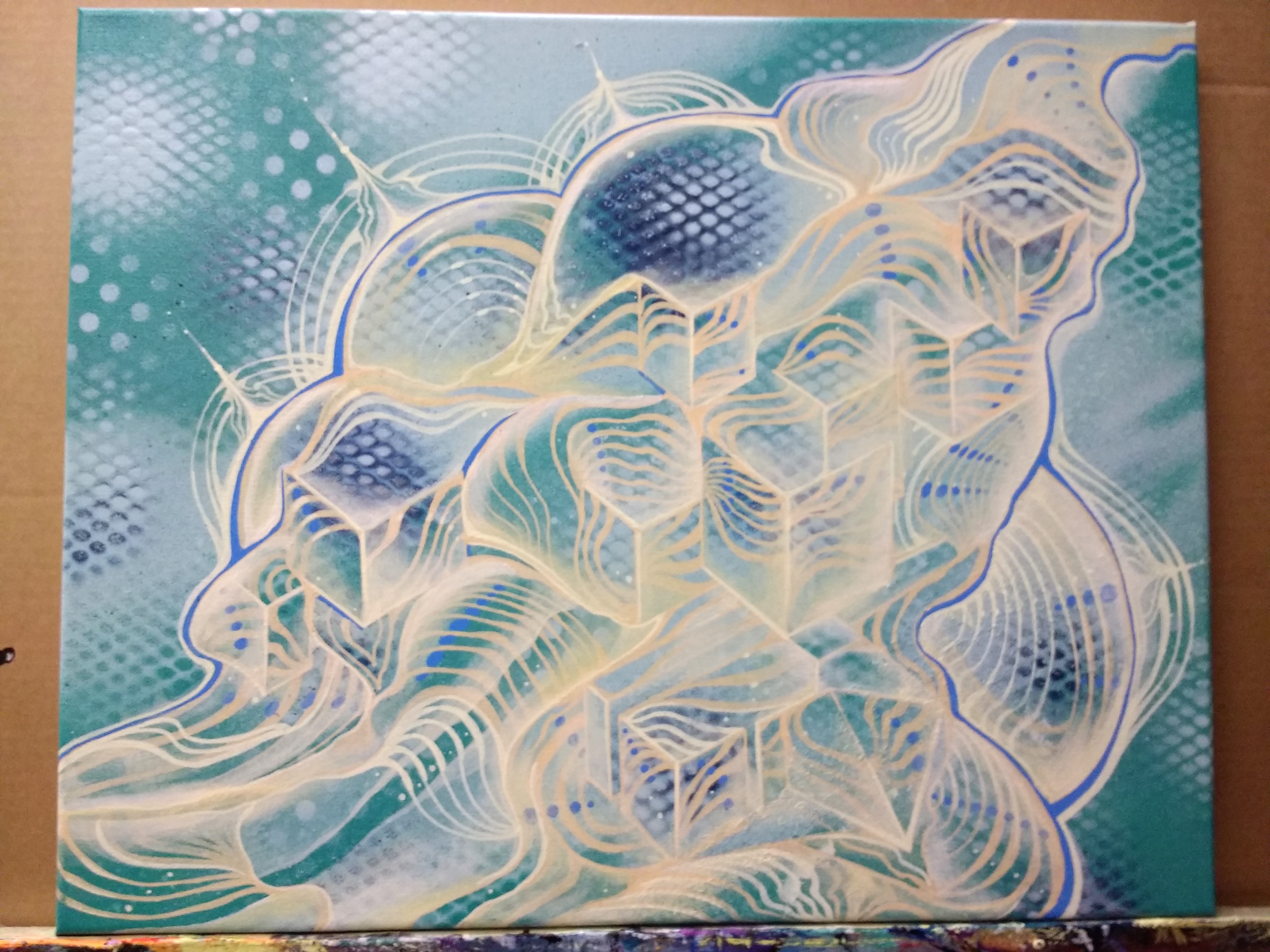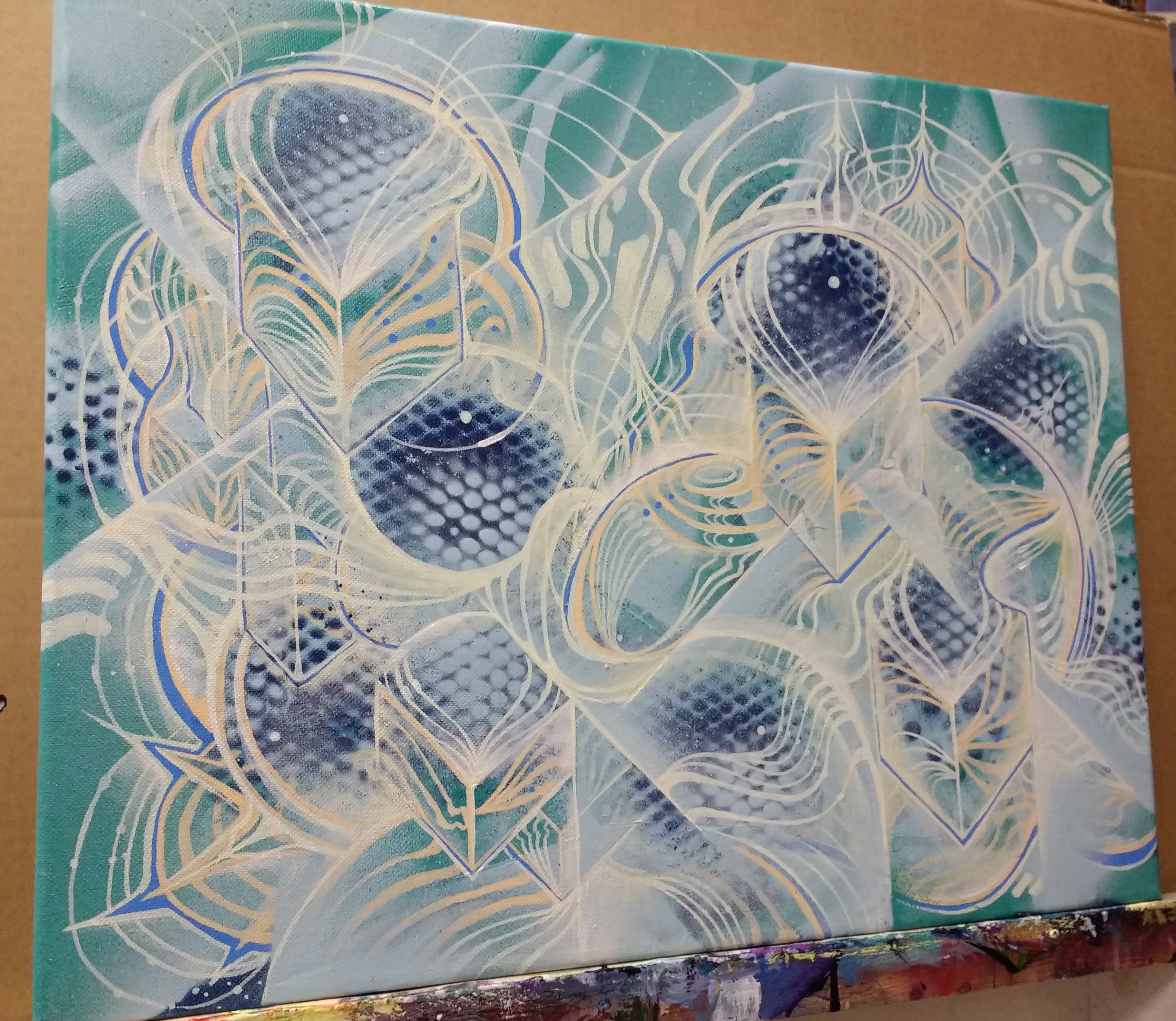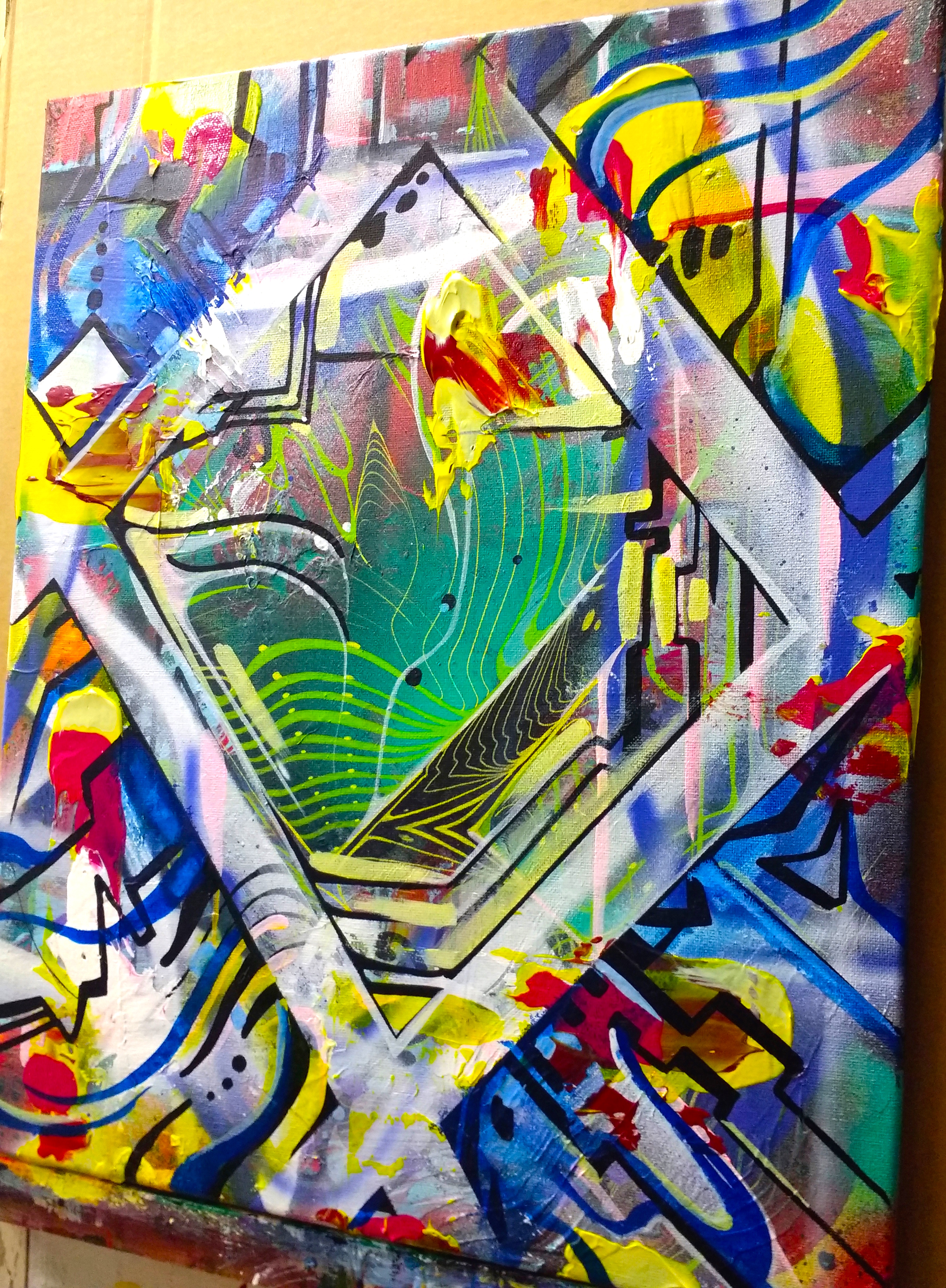 I like to experiment with paint and work in many layers. For these paintings I used spraypaint and acrylic paints applied with brushes, I also use artmarkers for the fine lines.