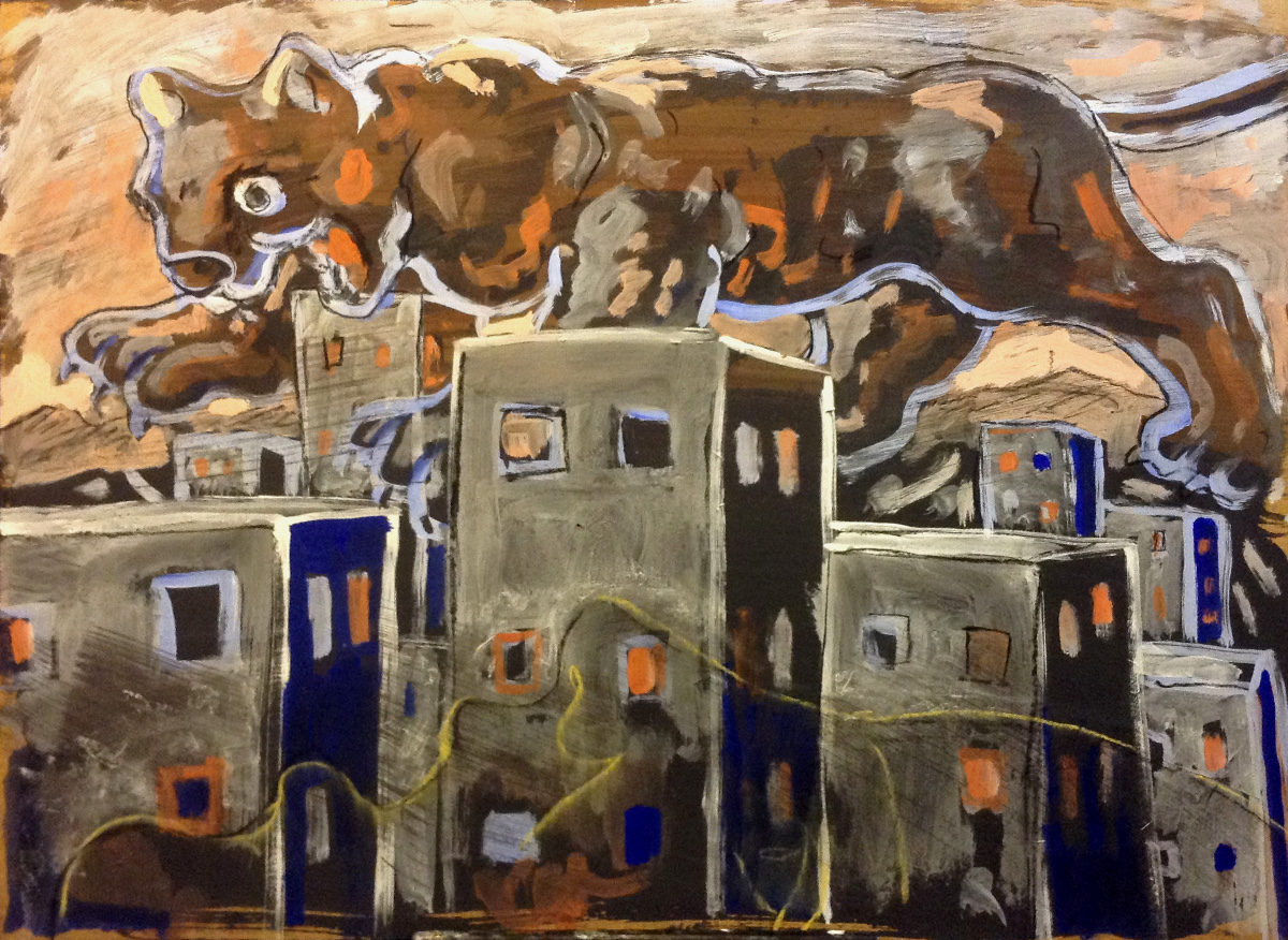 You painting looks really good, I love the color of your buildings and little lights in windows. Of course the main character is a panther or may be a cat, in Art everybody can interprets as he likes :)