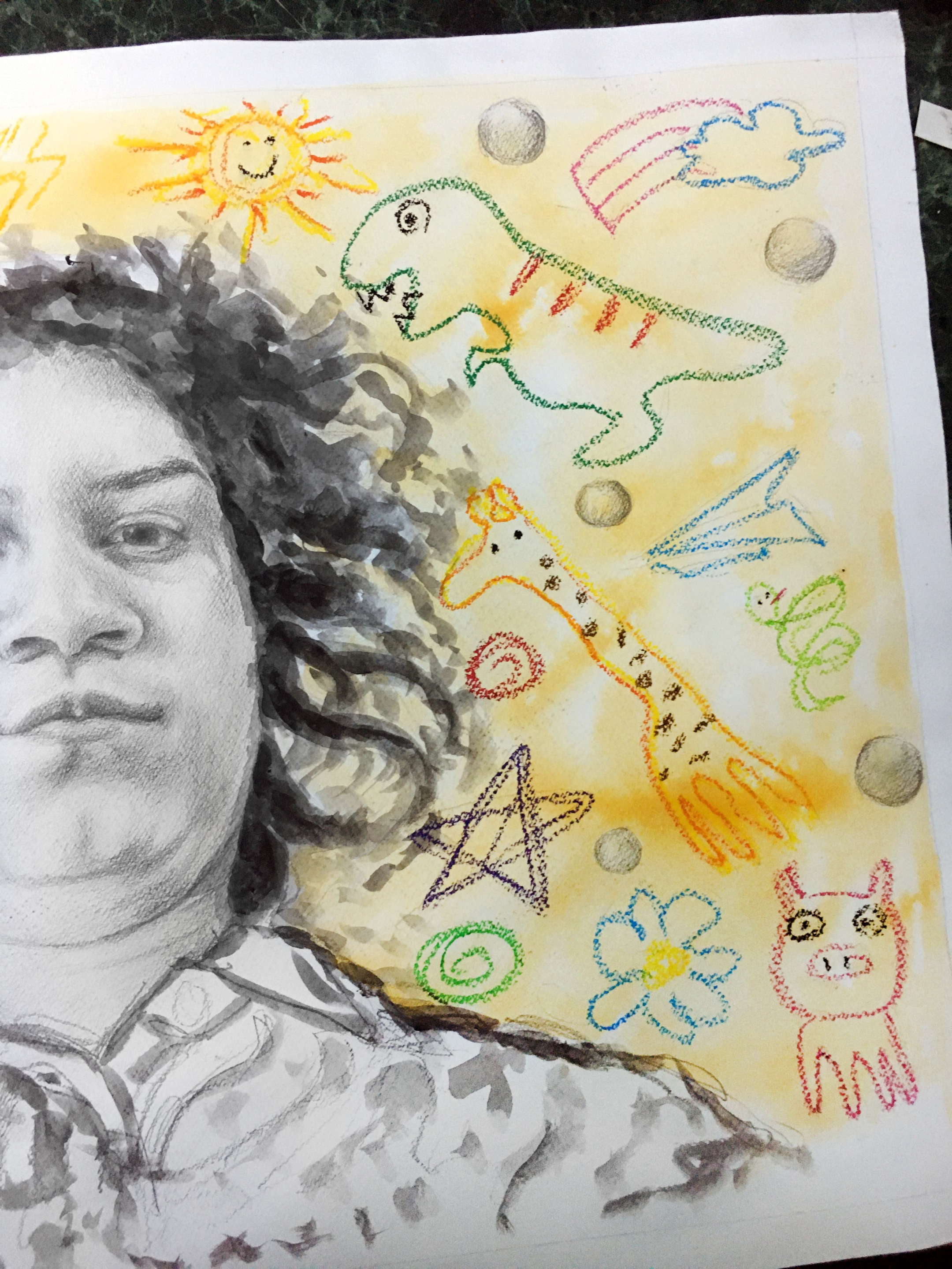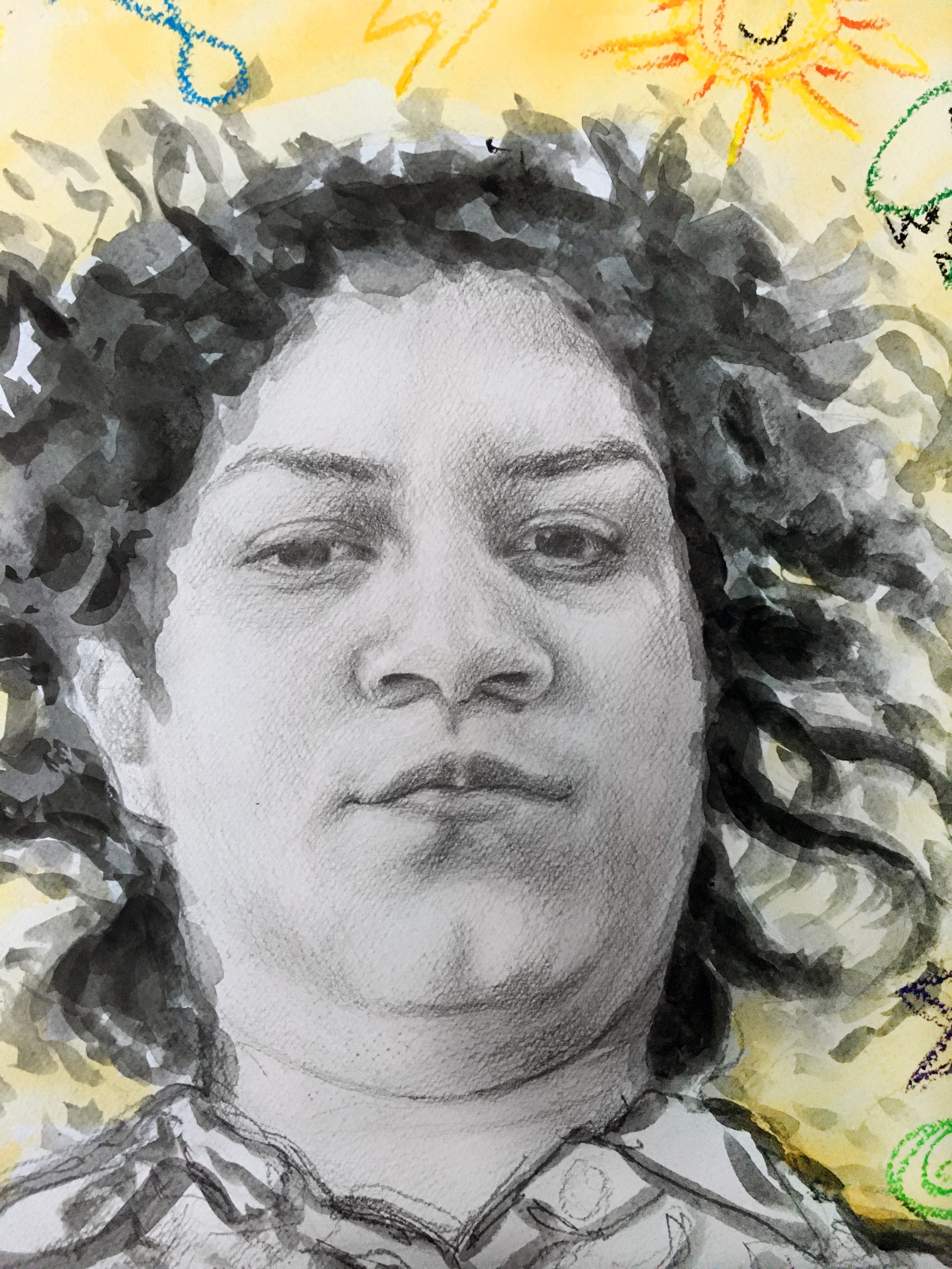 This is such a wonderful self portrait! I totally love it 🌝 Specially the kids-like drawings around, they make it special ❤️ you're awesome kiddo