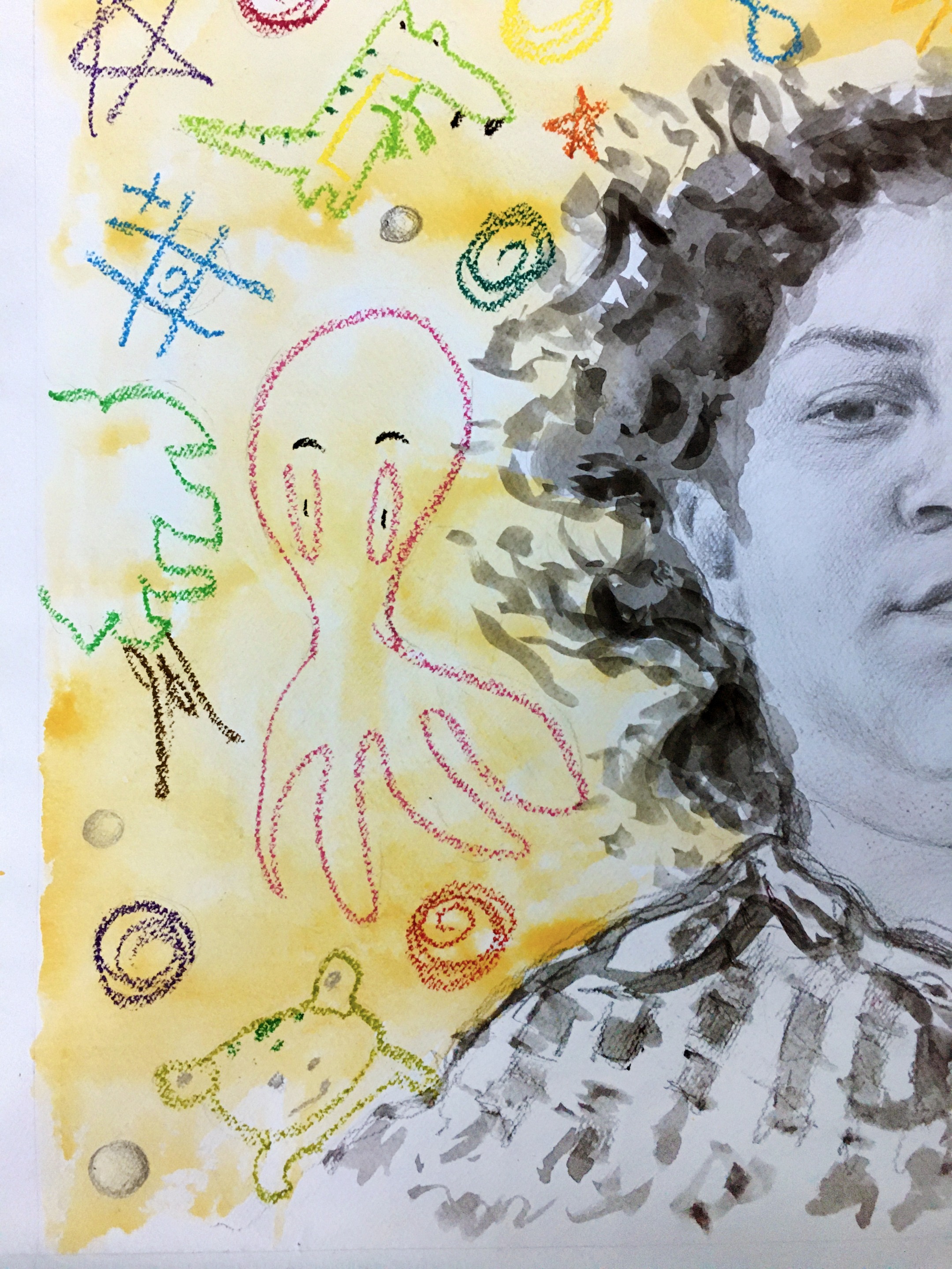 I used graphite pencils, the cheapest watercolors on Earth and oil pastels to make the doodles in the background.