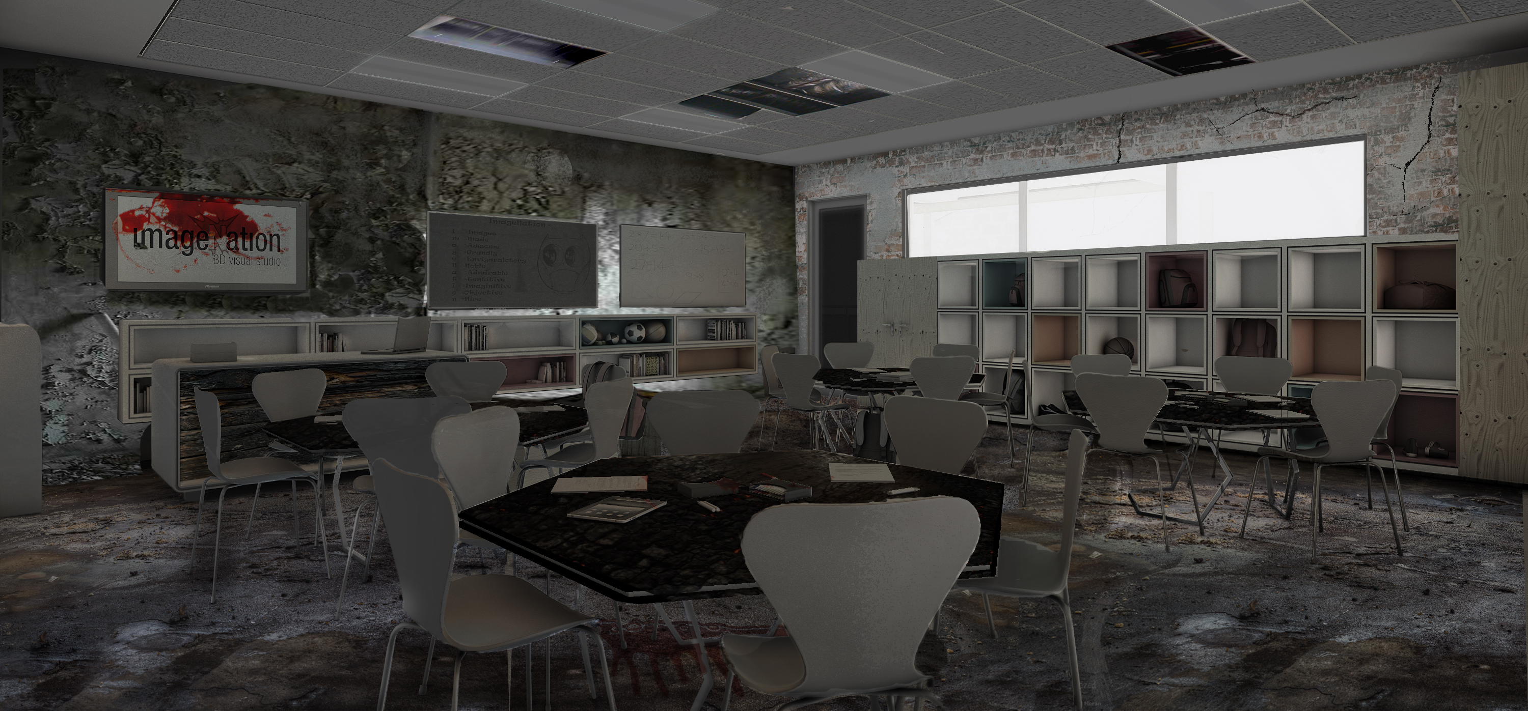 Abandoned Classroom Boredompercy1994 (49)in #art • 5 years ago I decided to take an old classroom render of mine and do some Halloween style photoshop to it originals #visualization #archviz #renders #graphic #graphicdesign #halloween